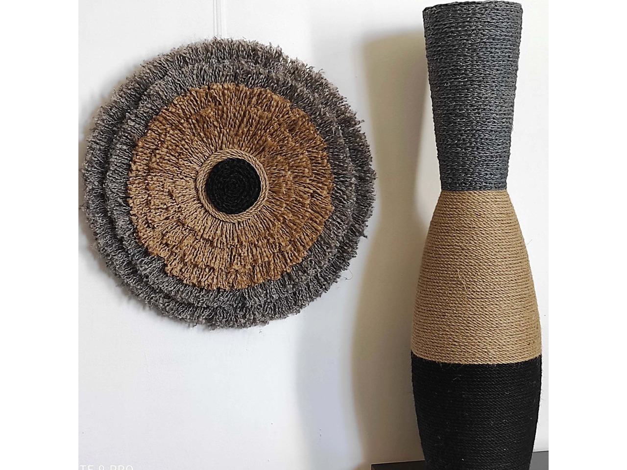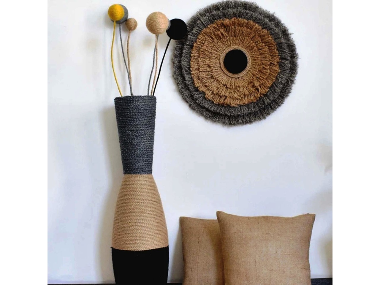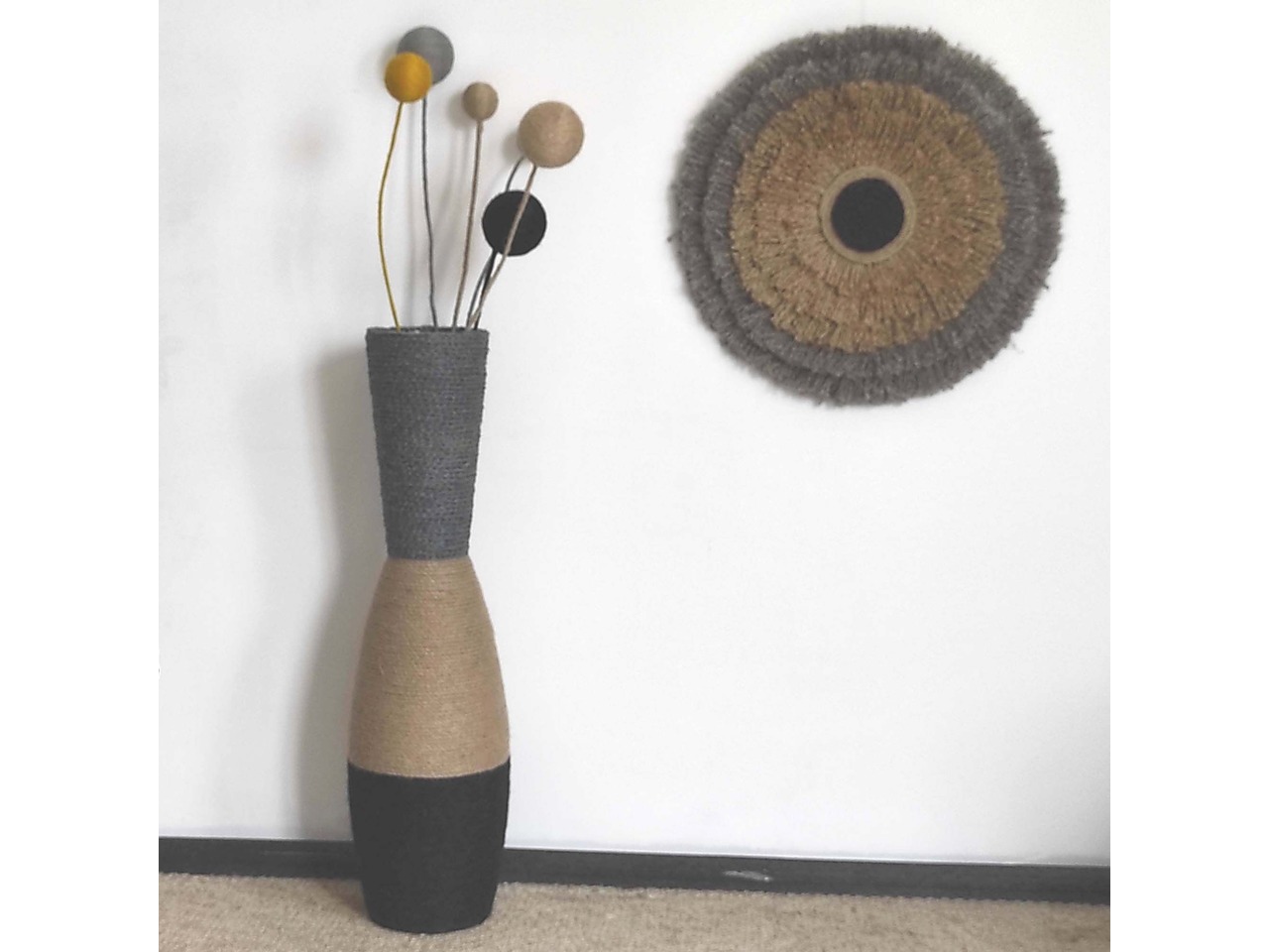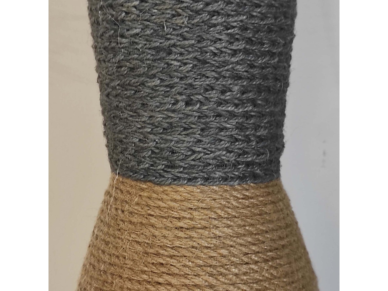 Скляна основа, обмотана натуральним джутом у чорному, коричневому та сірому кольорах, гармонійно поєднується зі стилями рустик, бохо, кантрі та лофт.