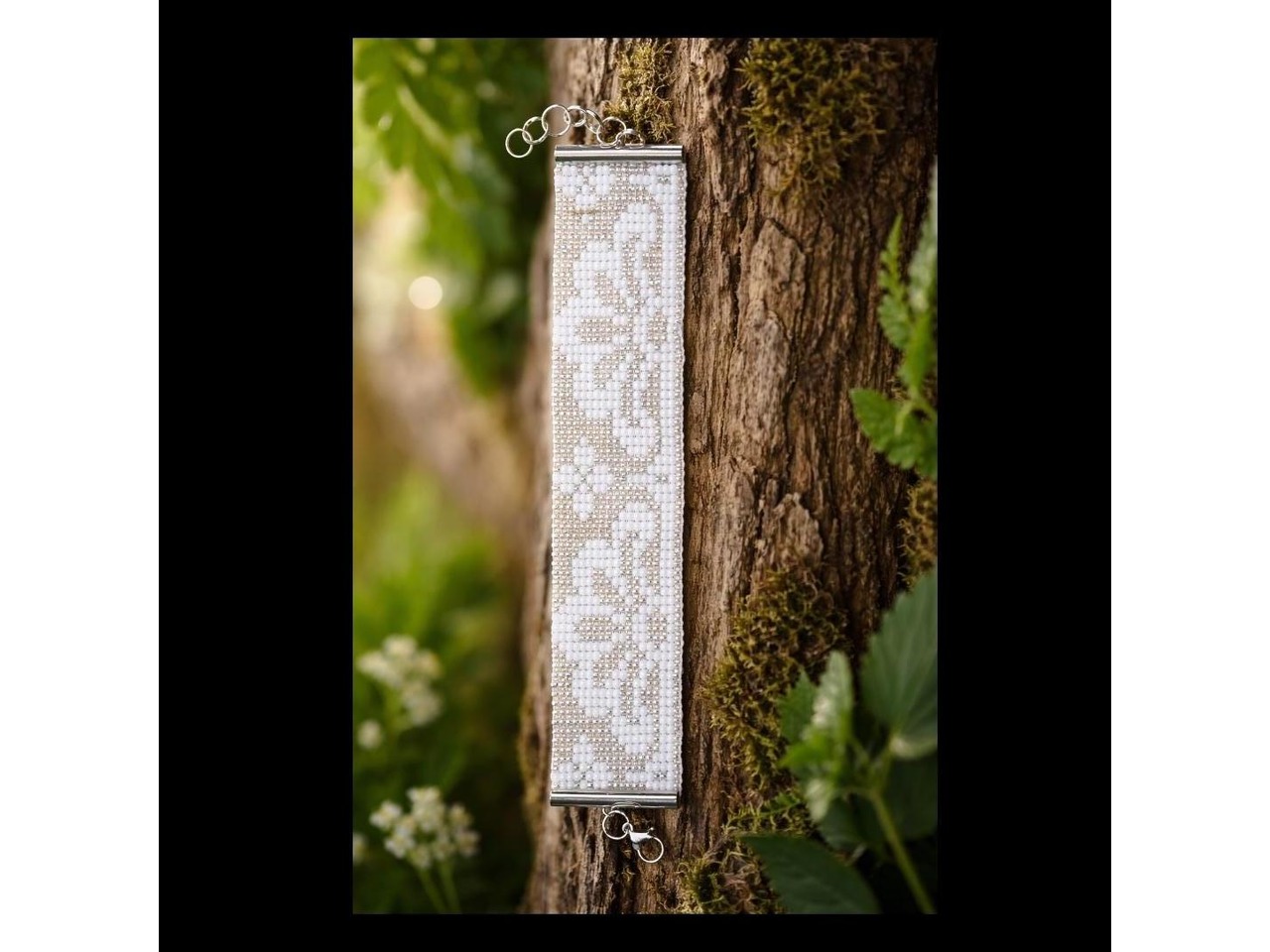 Браслет з бісеру з білим орнаментом (ручна робота)Елегантний браслет, створений вручну з дрібного бісеру, поєднує ніжний білий колір та витончений орнамент, що надає прикрасі легкості й жіночності. Акуратне плетіння формує щільну стрічку, яка комфортно сидить на зап’ясті та зберігає форму. Завдяки подовжувальному ланцюжку браслет легко регулюється під потрібний розмір.