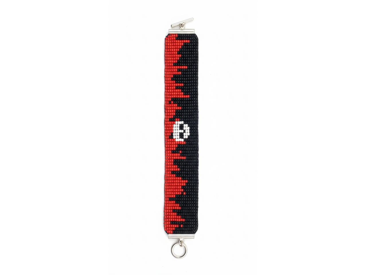 Браслет з бісеру з черепом та вогняним орнаментомЕфектний браслет ручної роботи з бісеру у чорних і червоних відтінках з контрастним мотивом полум’я та стилізованим черепом по центру. Дизайн поєднує в собі бунтарський характер і сучасну естетику, що робить прикрасу ідеальним аксесуаром для тих, хто любить виділятися. Браслет стане яскравим доповненням до повсякденного образу, рок-стилю або streetwear.