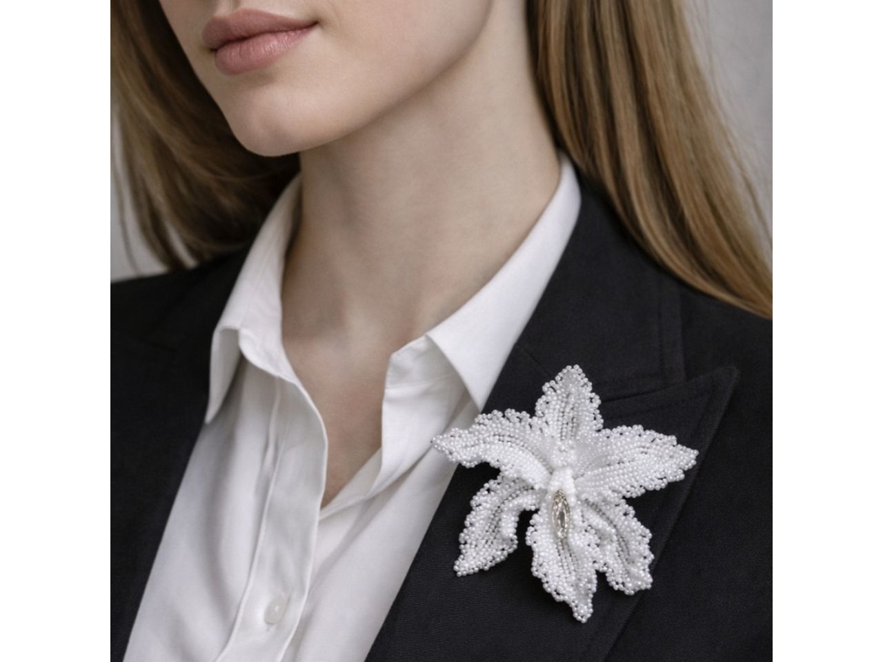 Вишукана брошка «Орхідея», створена вручну з чеського бісеру — символ ніжності, елегантності та жіночої сили. Кожна пелюстка пропрацьована до дрібниць, щоб передати природну красу цієї квітки.Брошка легка, але добре тримає форму, має надійне кріплення, декоративний кристал у центрі, унікальний дизайн. Розмір 10 х 11 см. Спеціальне кріплення дозволяє надіти квітку до намиста і таким чином можна змінювати та доповнювати образ. Намисто під замовлення за індивідуальною довжиною. До комплекту можна замовити і браслет і серги.