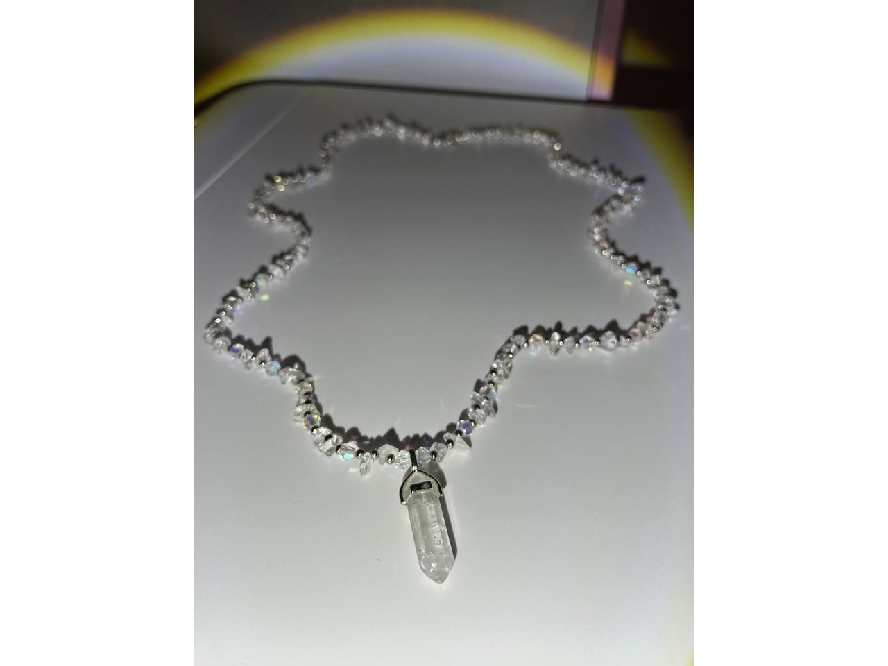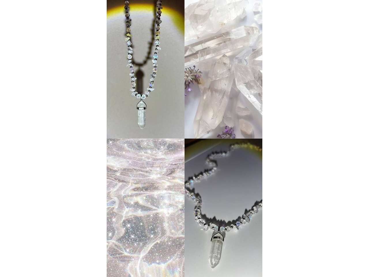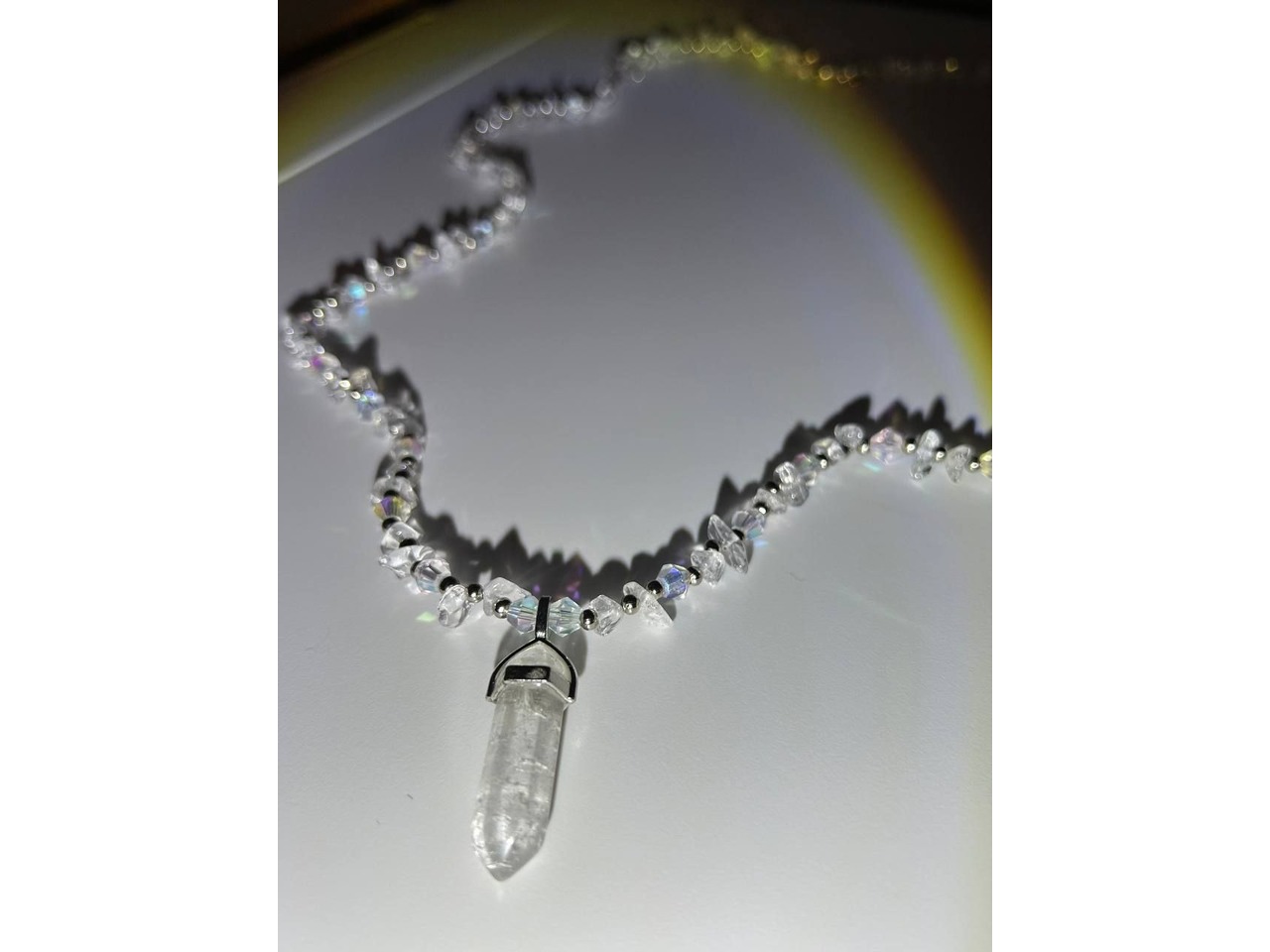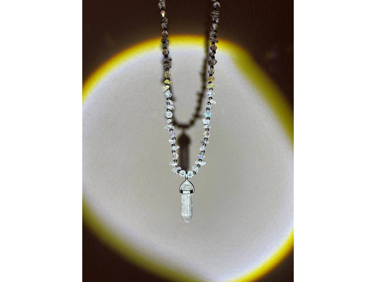 Кришталева магія• Витончене намисто з гірського кришталю, що переливаються на світлі, створюючи ефект чарівного сяйва. Центральний елемент – підвіска з гірського кришталю, символ чистоти, гармонії та внутрішньої сили. Маленькі грановані намистини та металеві вставки додають прикрасі елегантності й загадковості.