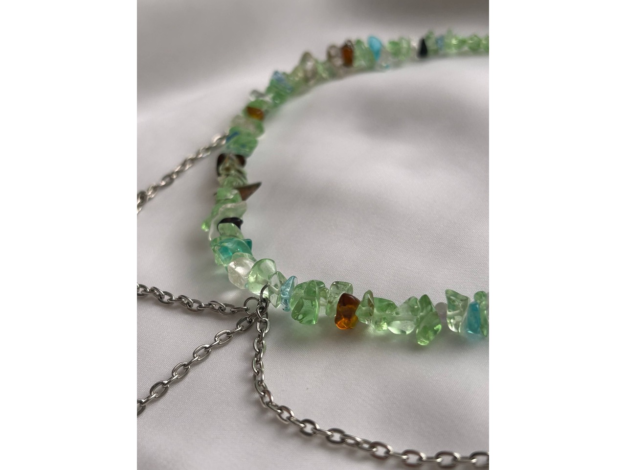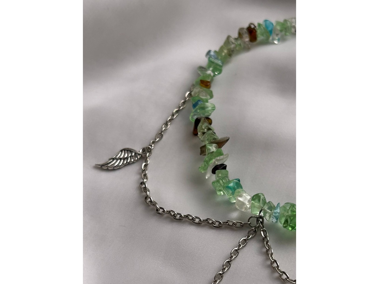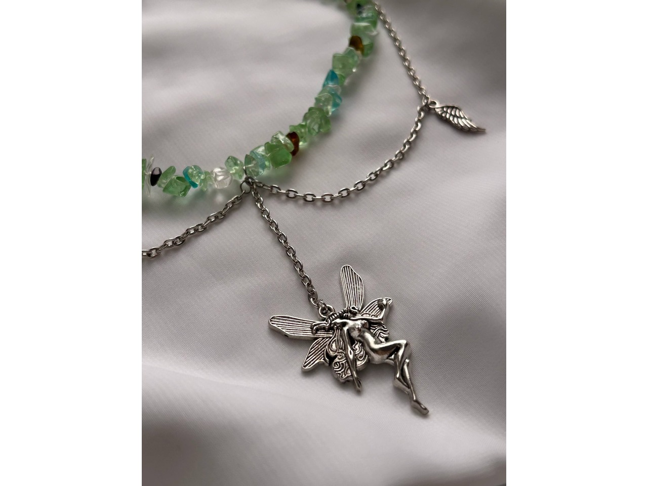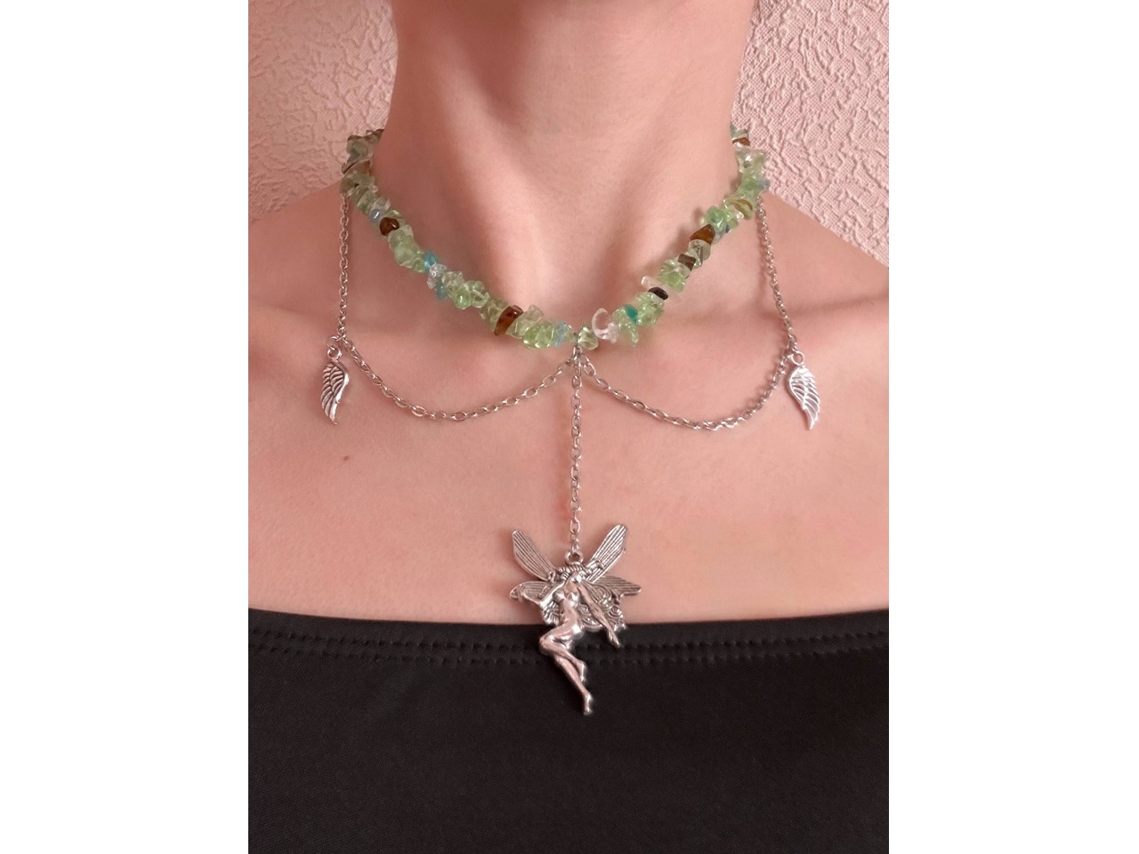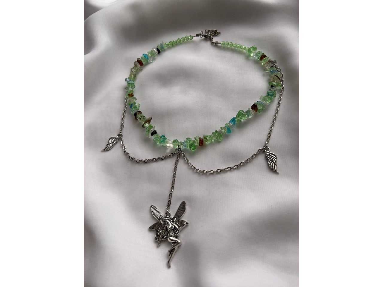 • Прикраса «Лісова Фея» — це ніжне втілення магії природи та чарів світу фентезі. Зелено-коричневі камінці, що нагадують мох і бурштин, формують основу чокера, немов стежину в зачарованому лісі. Сріблясті ланцюжки з підвісками у вигляді листочків і головною фігурою — феєю з розкритими крилами — додають прикрасі ельфійської грації та романтики.• Довжина виробу 35,5 см(+4,5 см подовжуючий ланцюжок)