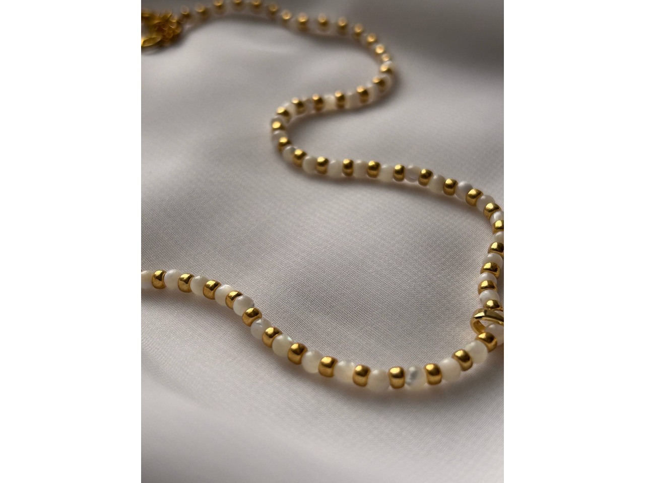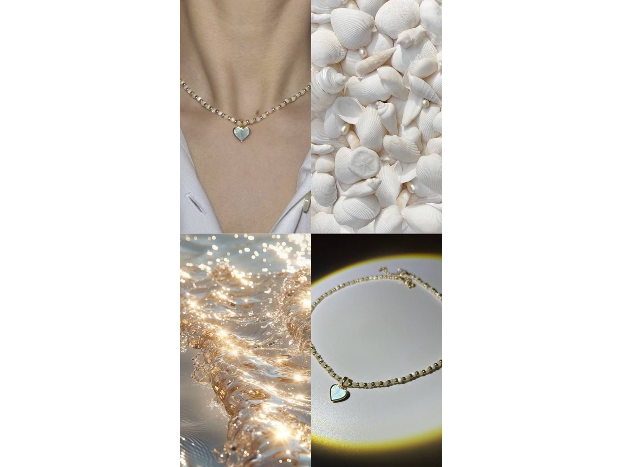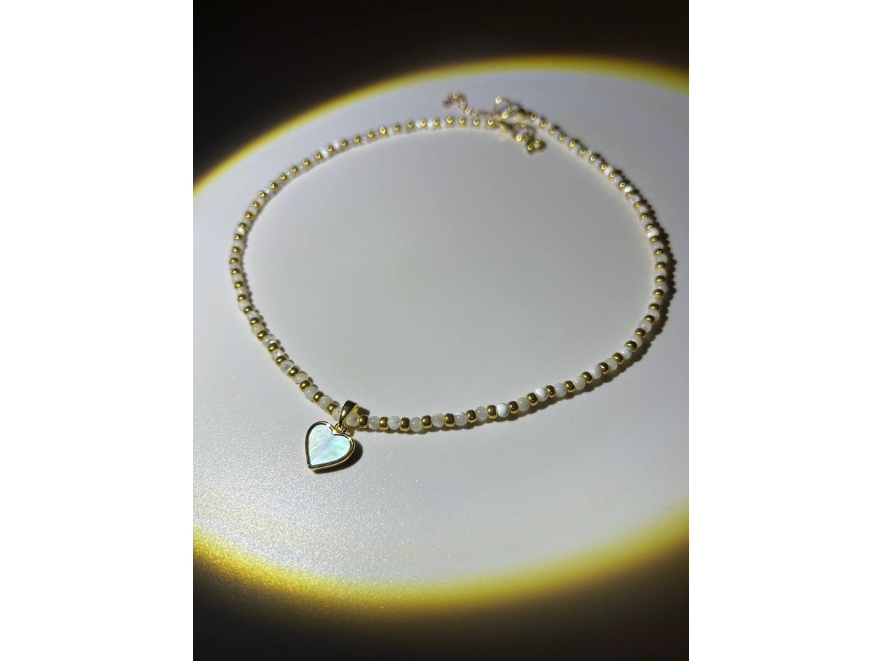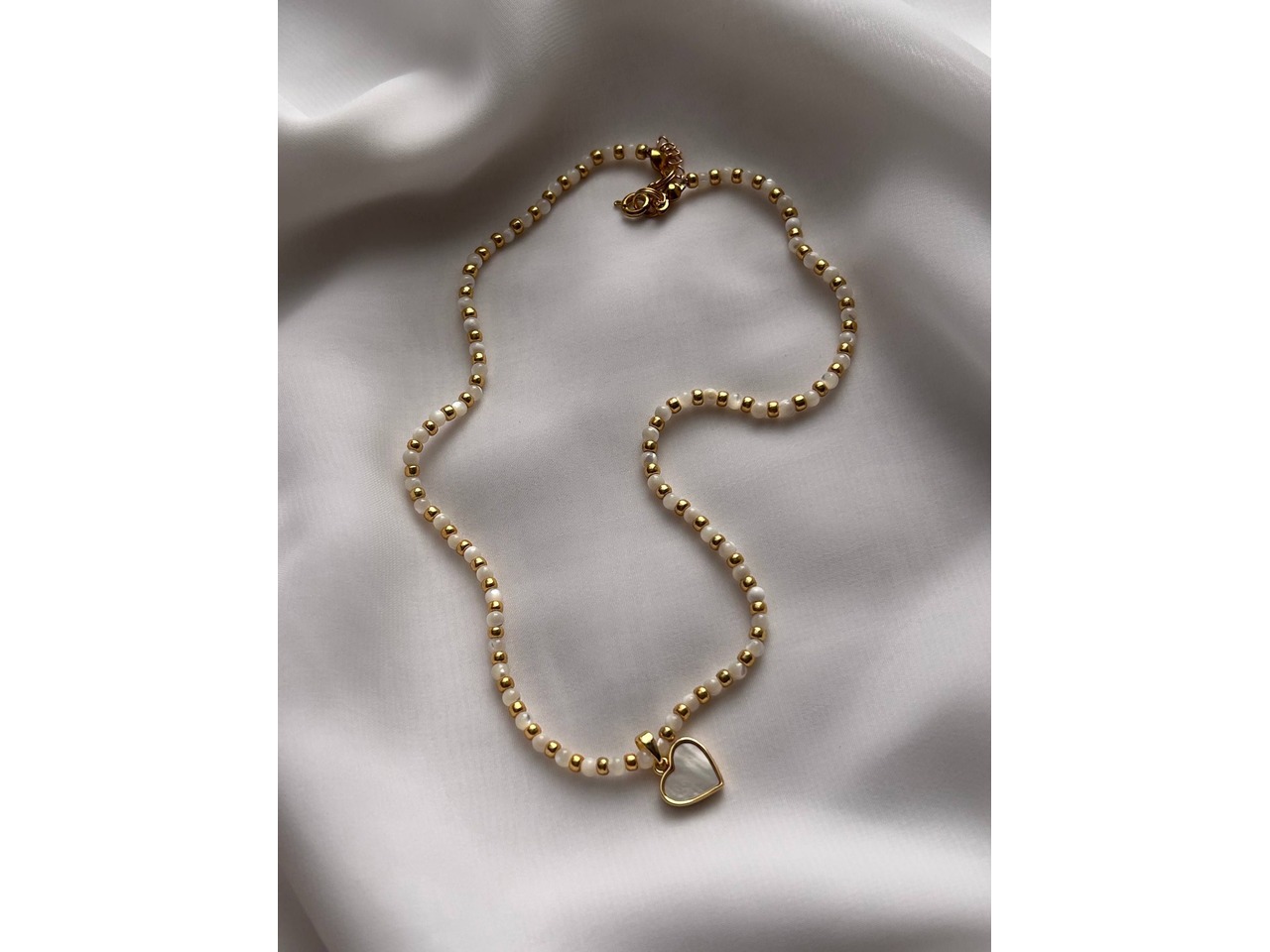 • Намисто виконано з намистин із морських мушель, які гармонійно поєднані з кулоном у формі серця, виготовленим із натурального річкового перламутру.