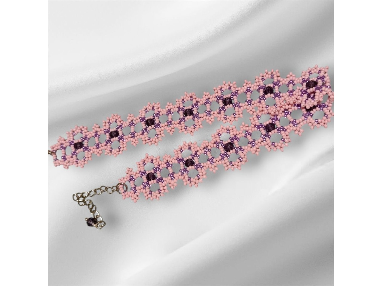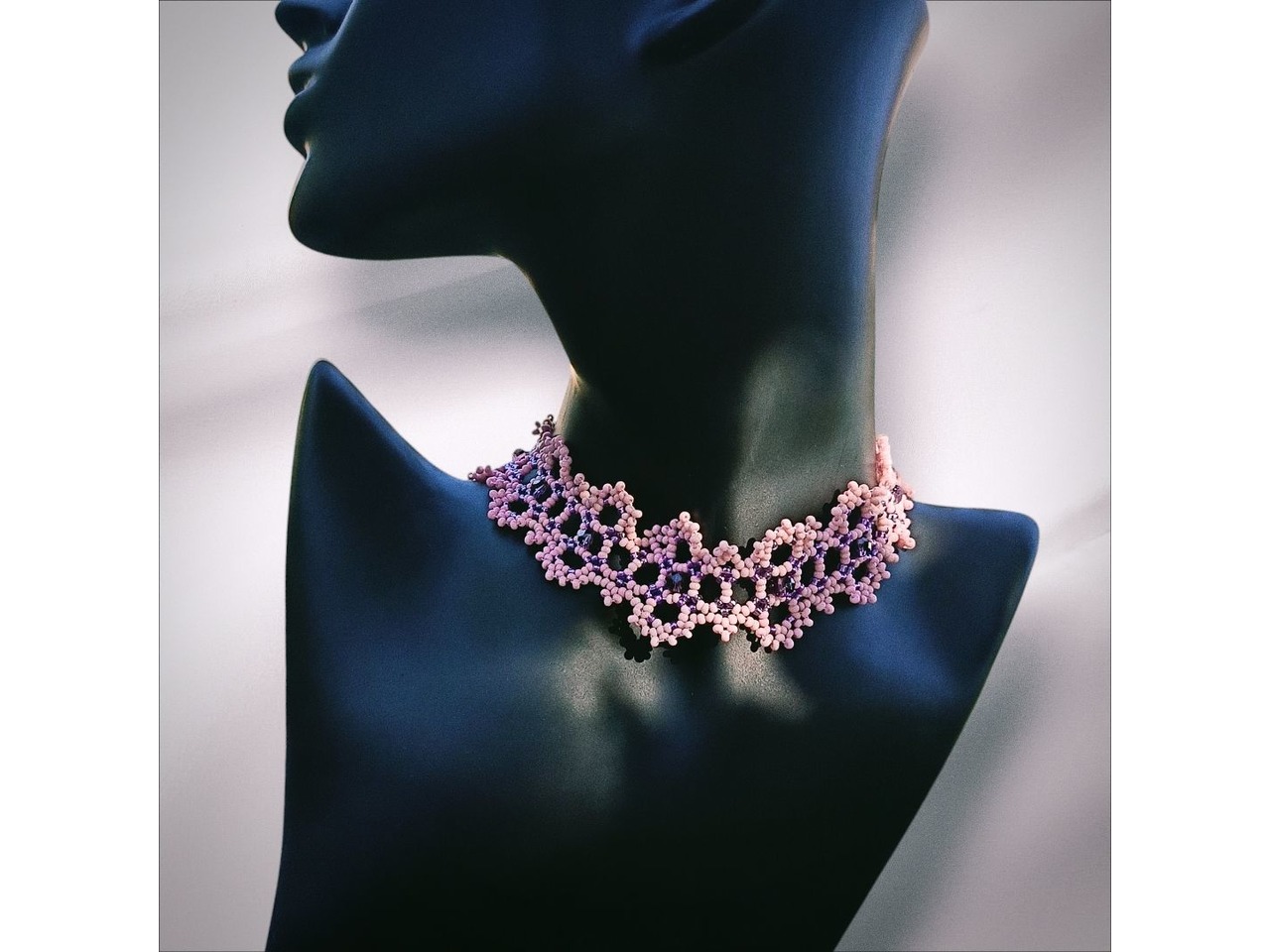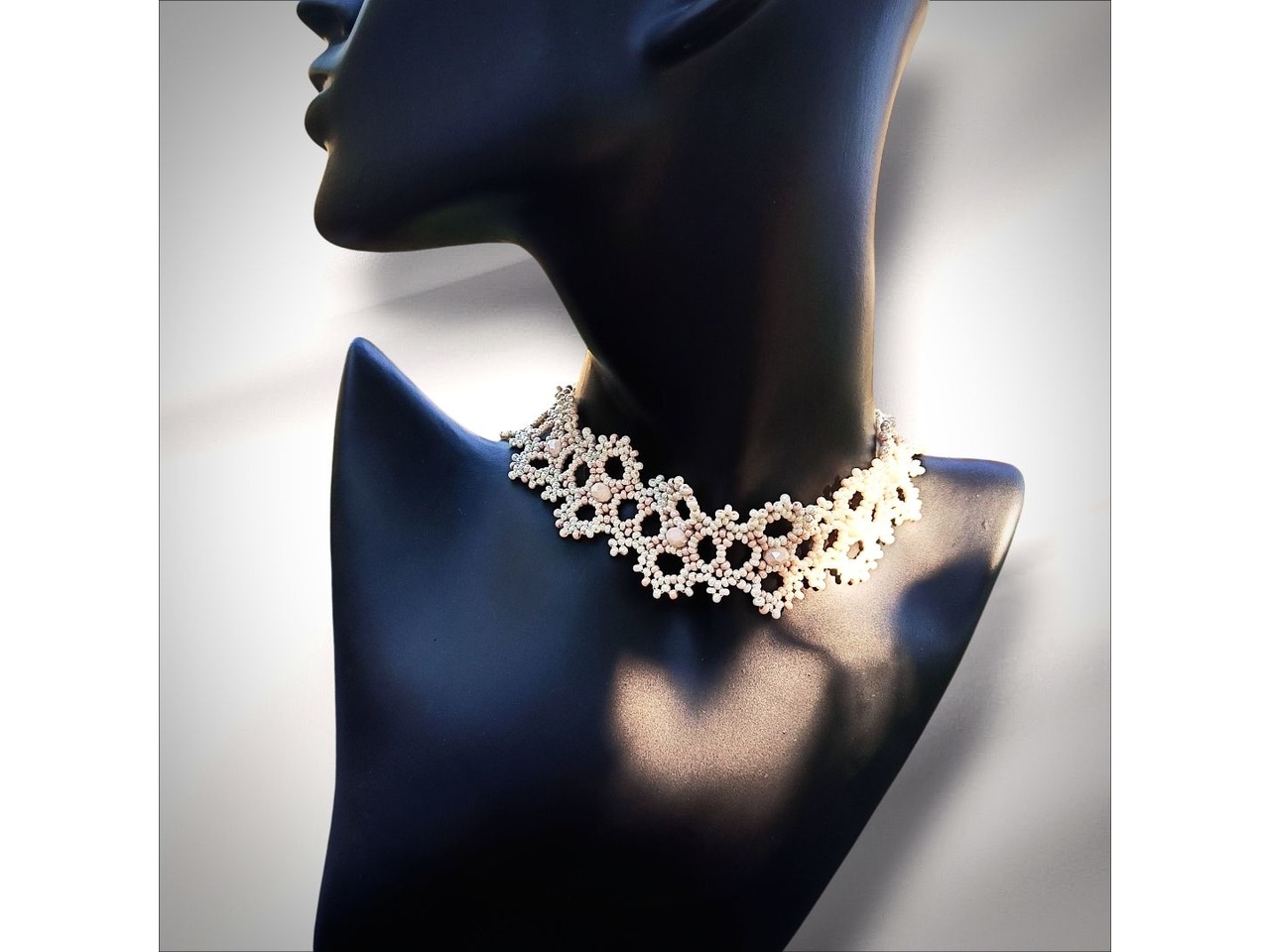Ніжний чокер, створений з білого бісеру та декоративних намистин, стане ідеальним акцентом для нареченої або для урочистої події. Витончене плетіння нагадує мереживо та додає романтики образу. Прикраса створена вручну з турботою про кожну деталь. В наявності білий, чорний, бежевий, червоний та рожевий. Довжина 32 см із застібкою, подовжувач 7 см, ширина 3 см. Під замовлення виготовлю в будь-якому кольорі та за індивідуальними замірами.