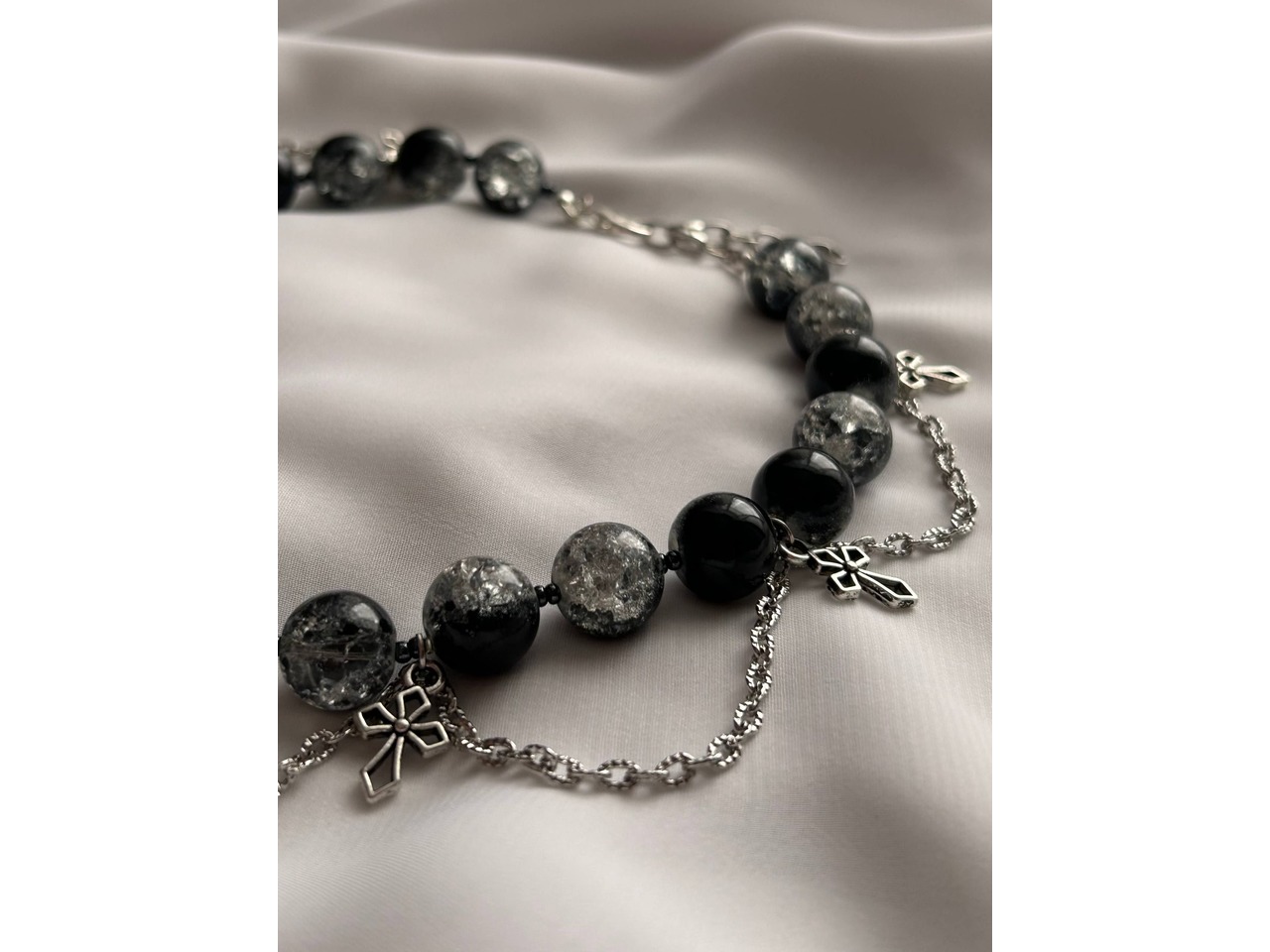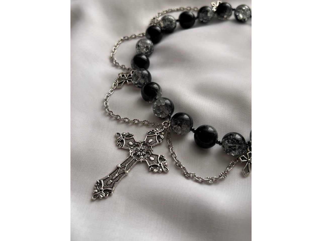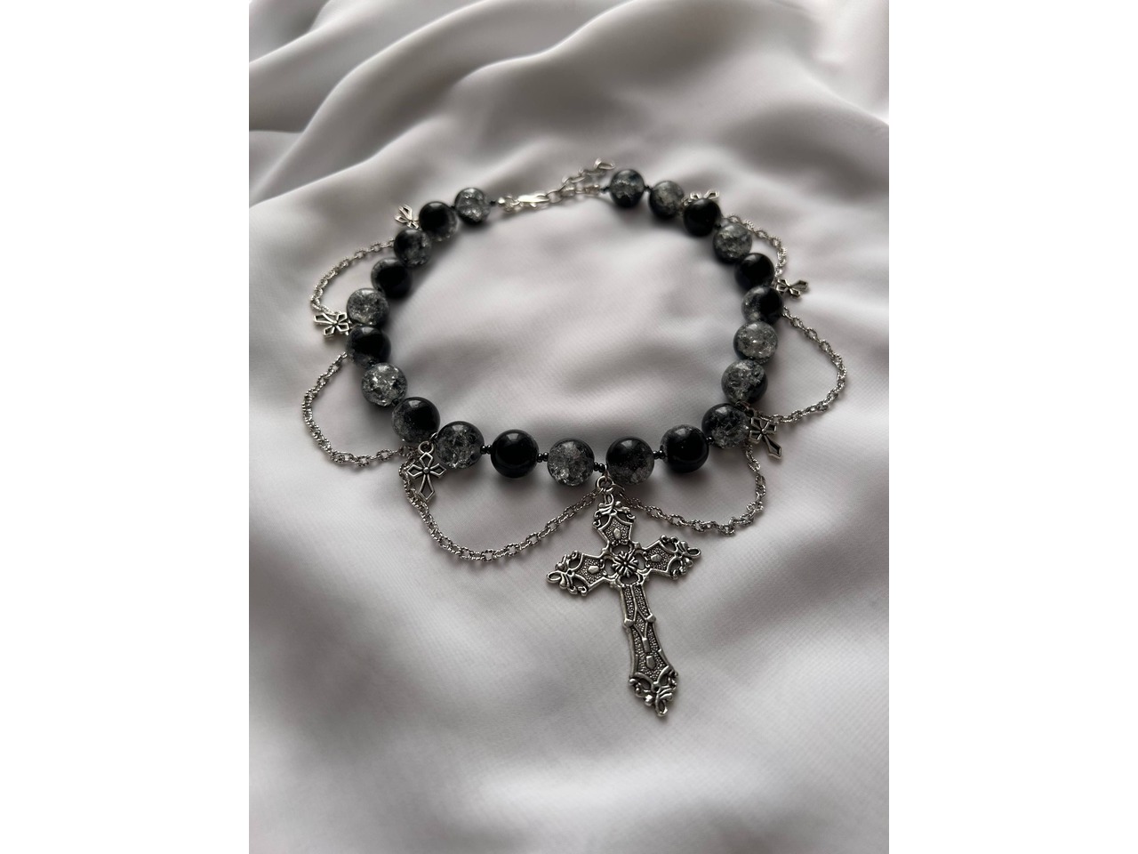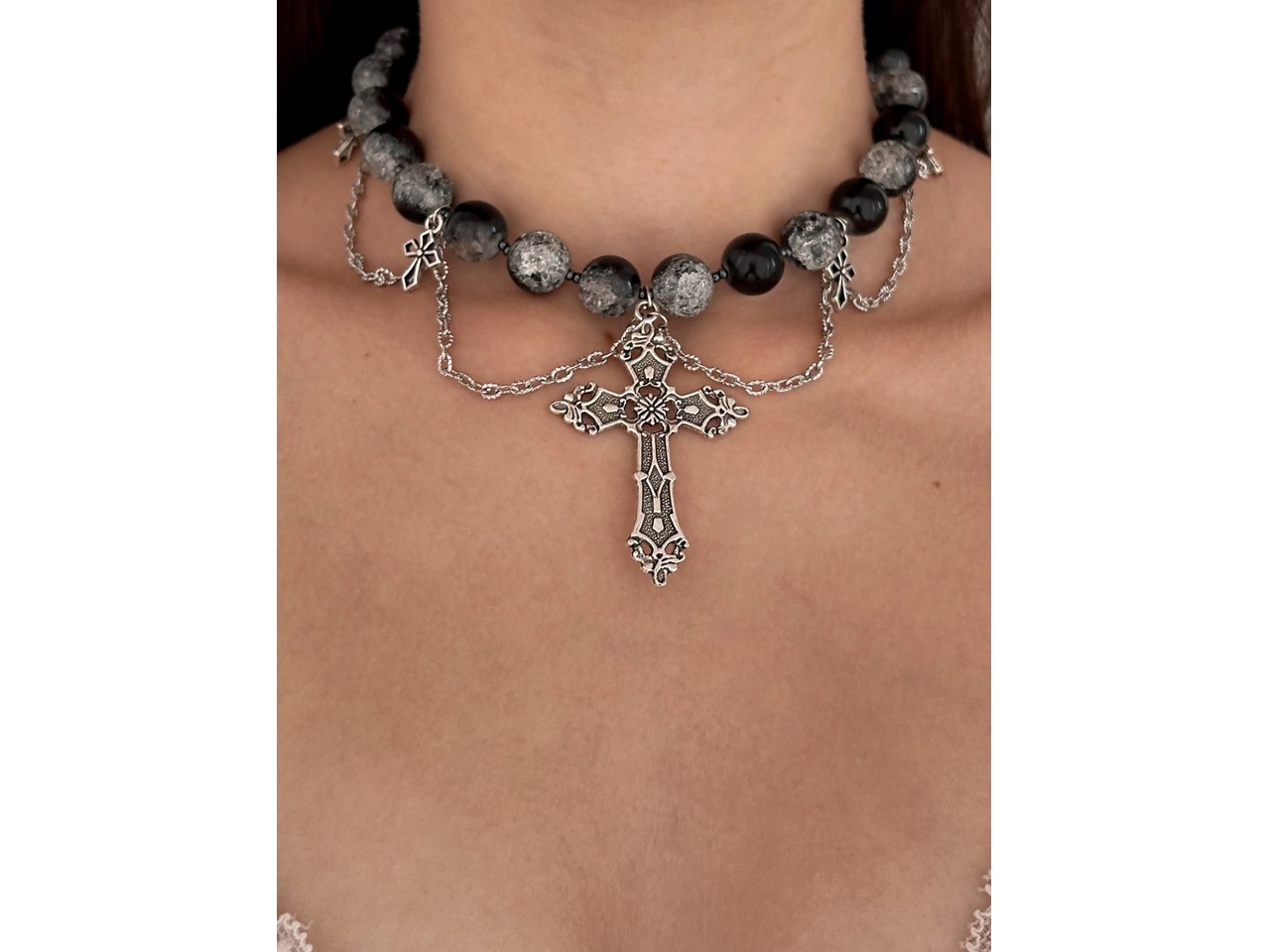 • Цей чокер — ідеальний вибір для тих, хто шукає щось драматичне, емоційне та по-справжньому стильне. Вишуканий хрест у центрі, прикрашений ланцюгами та декоративними елементами, додає глибини, загадковості та сили образу.