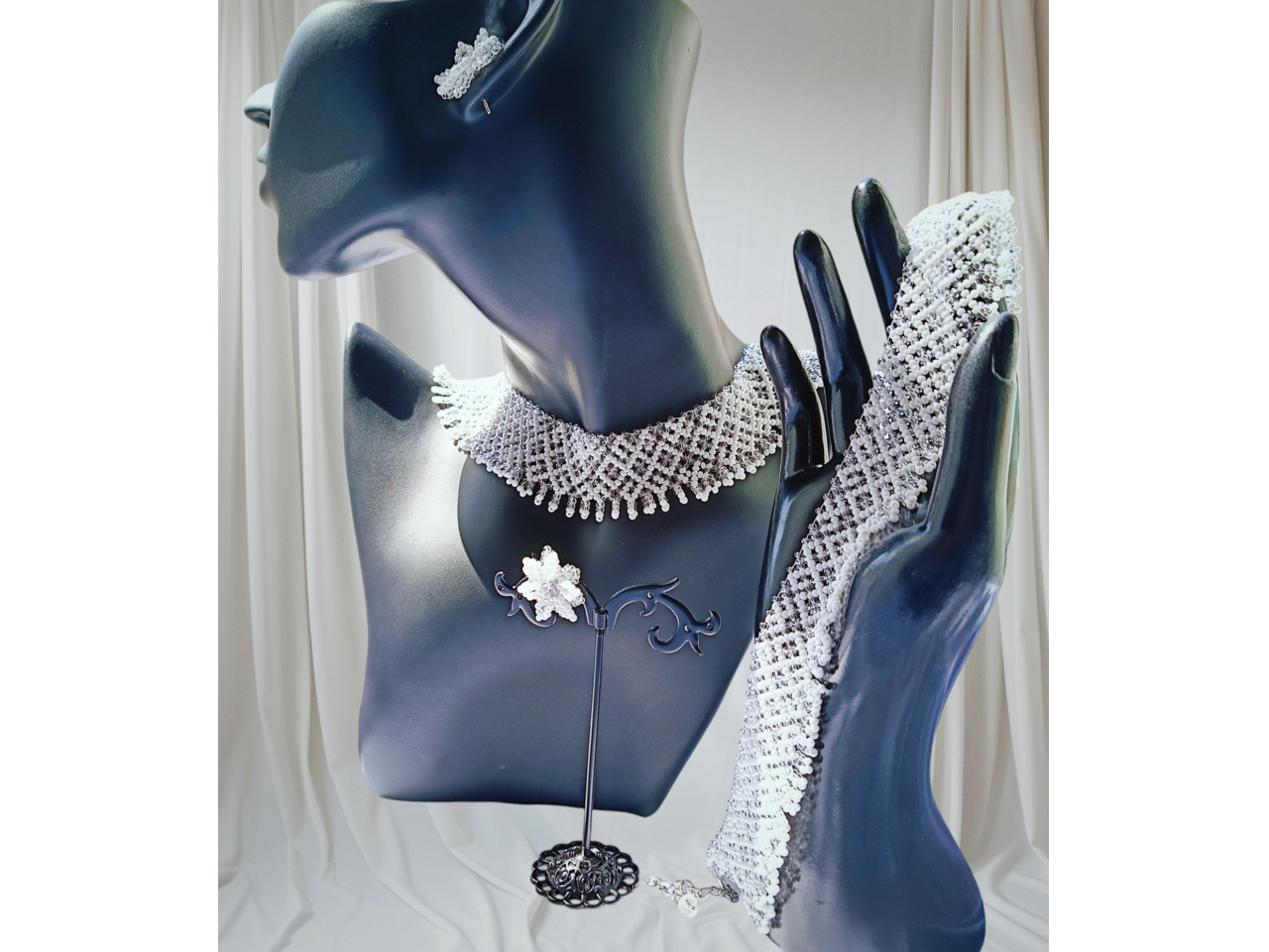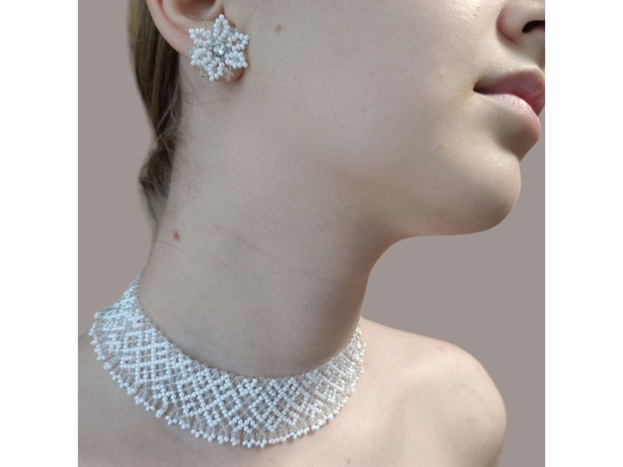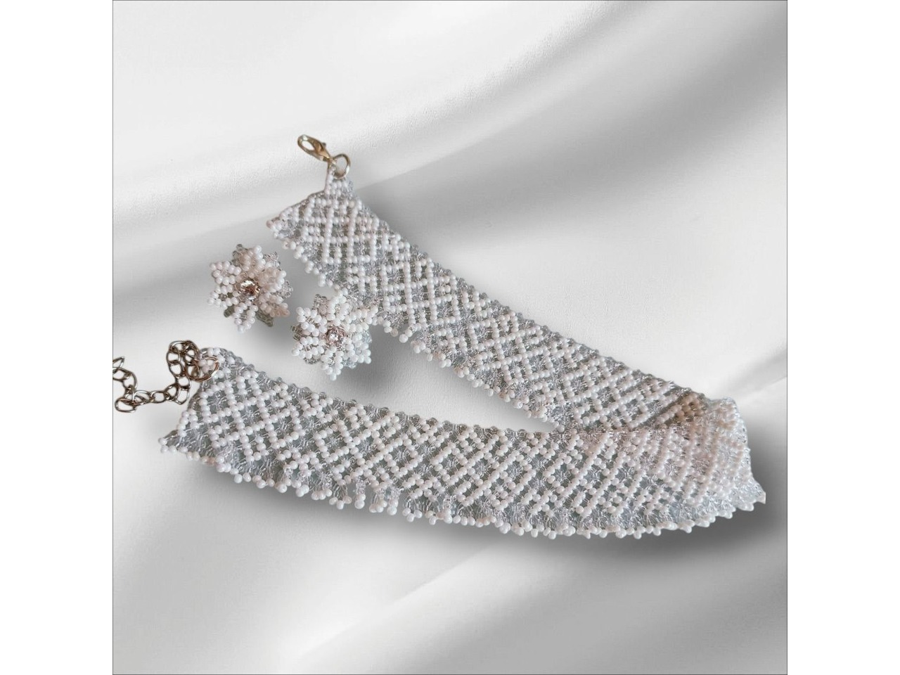 Стильний, елегантний і неймовірно ніжний комплект прикрас ручної роботи виготовлений з чеського бісеру. Довжина кольє 32 см, подовжувач 6 см. Ширина 3 см. В комплекті серги пусети квітоньки діаметр 2 см, швензи з гіпоалергенного сплаву.