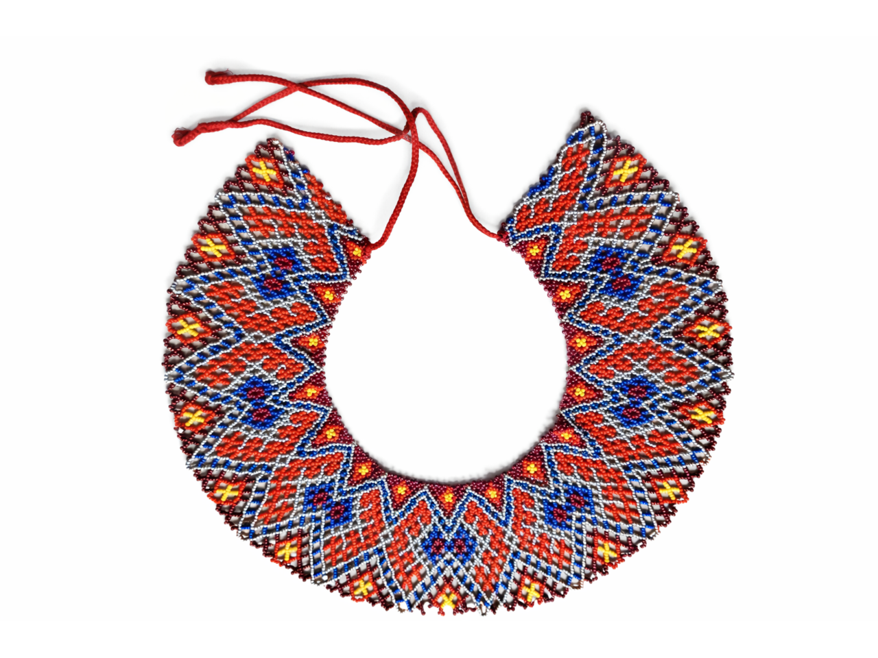 **Силянка з бісеру в українському орнаменті**Розкішна силянка ручної роботи, виконана з дрібного бісеру у традиційній українській стилістиці. Геометричний орнамент поєднує насичені відтінки червоного, синього, жовтого, бордового та сріблястого кольорів, створюючи виразний та гармонійний візерунок. Кожна деталь сплетена вручну з великою увагою до симетрії та якості.