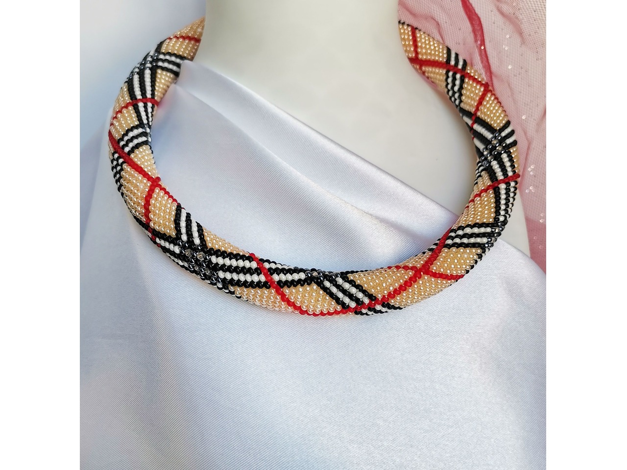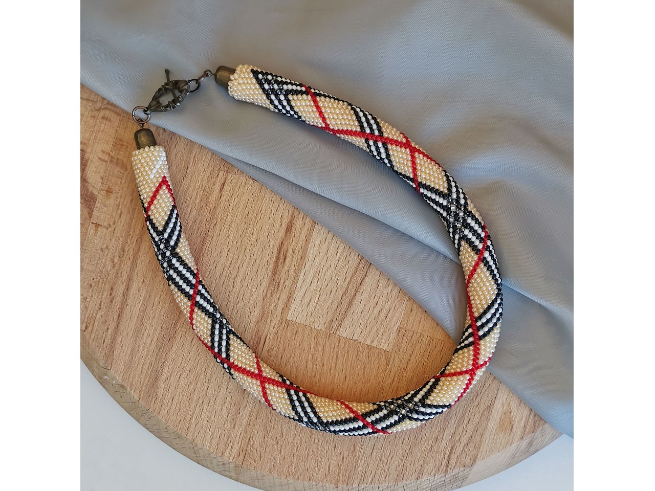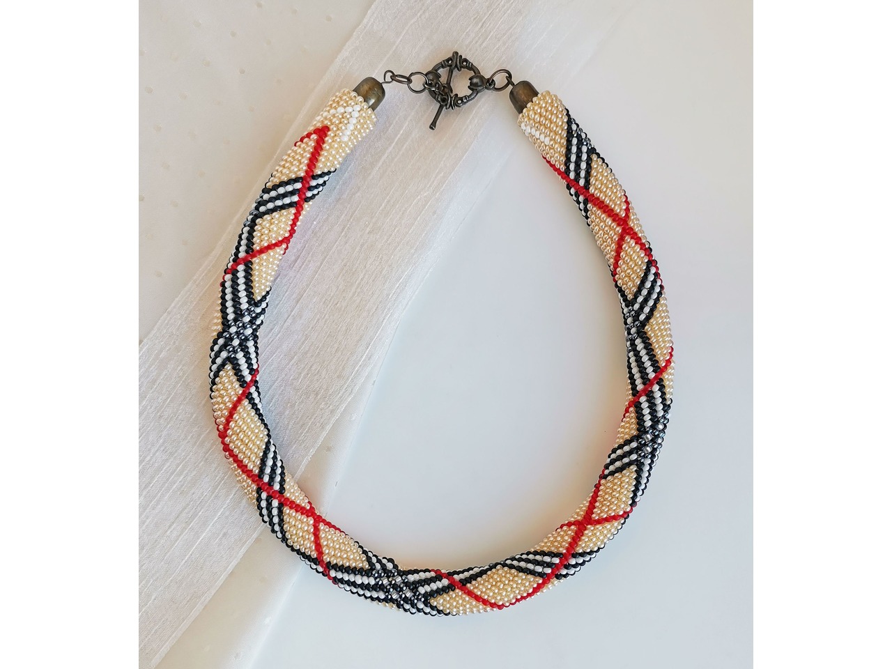Вишукана прикраса-джгут ыз чеського бісеру, натхненна культовою естетикою Burberry. Статус і витонченість, характер і краса. Це кольє - вибір для тих, хто цінує брендовий стиль, актуальність поза часом і елегантну виразність без зайвої демонстративності. Довжина з застібкою близько 42 см, можна продовжити ланцюжком. Більше моїх робіт в інст:tatianalevchenko165