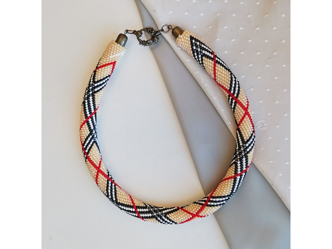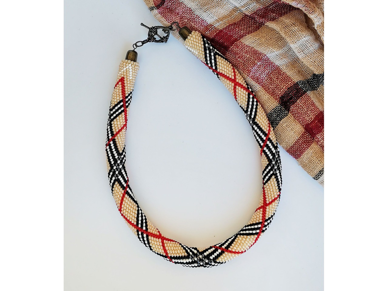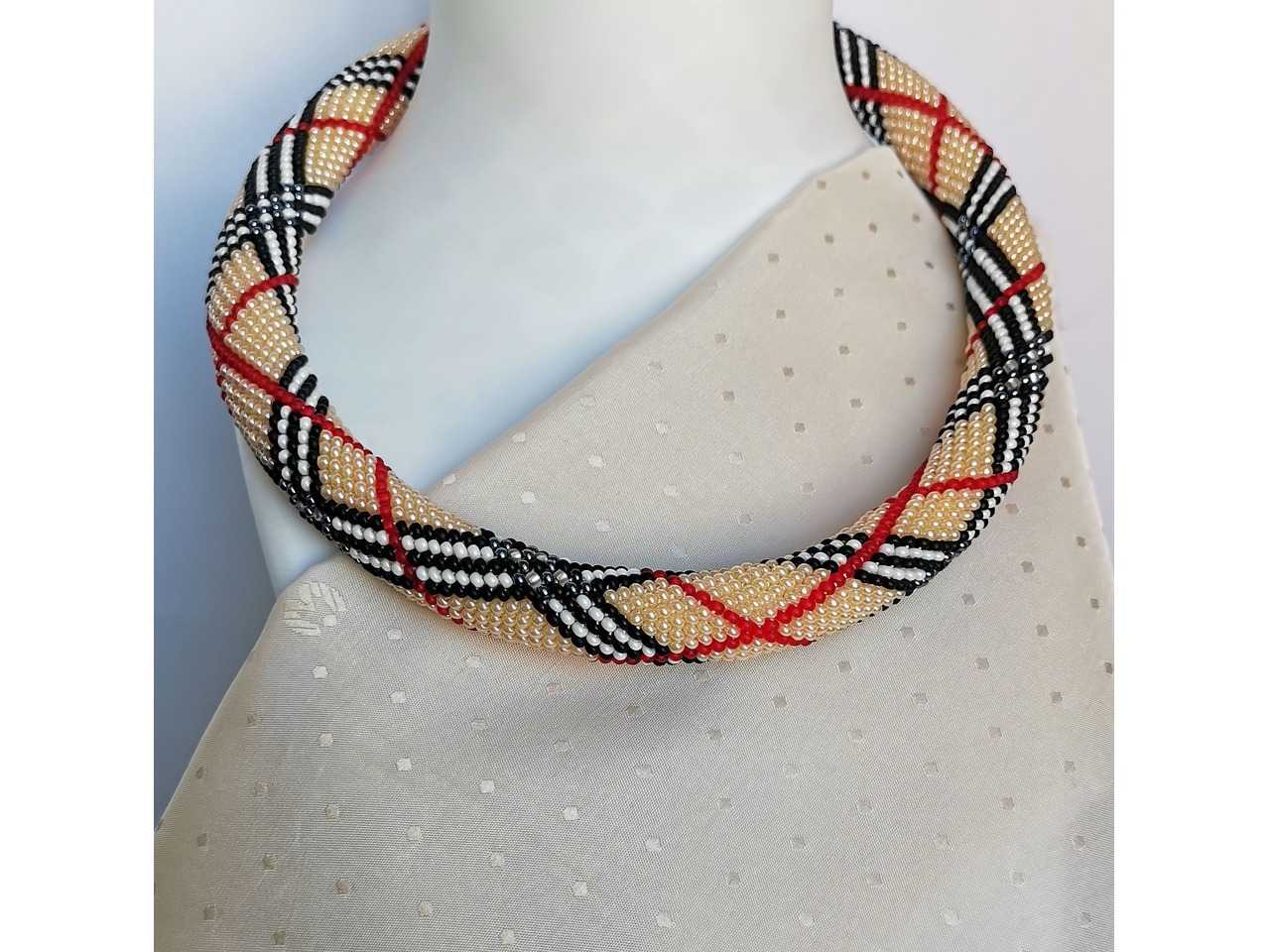 Вишукана прикраса-джгут ыз чеського бісеру, натхненна культовою естетикою Burberry. Статус і витонченість, характер і краса. Це кольє - вибір для тих, хто цінує брендовий стиль, актуальність поза часом і елегантну виразність без зайвої демонстративності. Довжина з застібкою близько 42 см, можна продовжити ланцюжком. Більше моїх робіт в інст:tatianalevchenko165