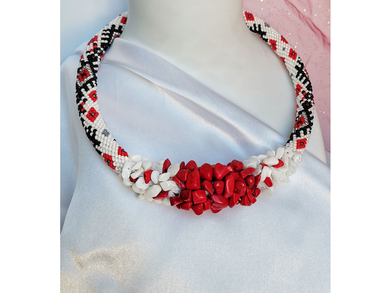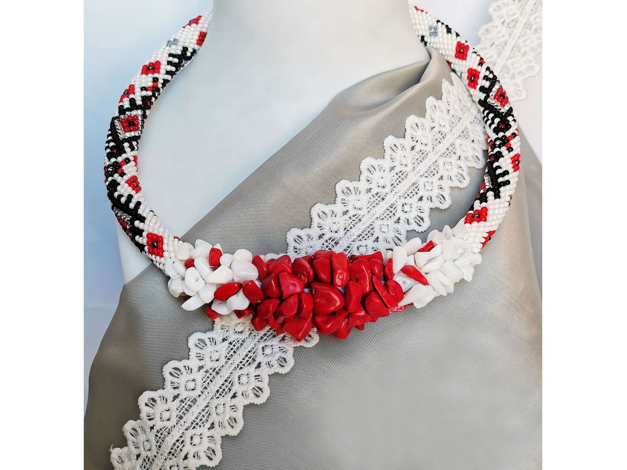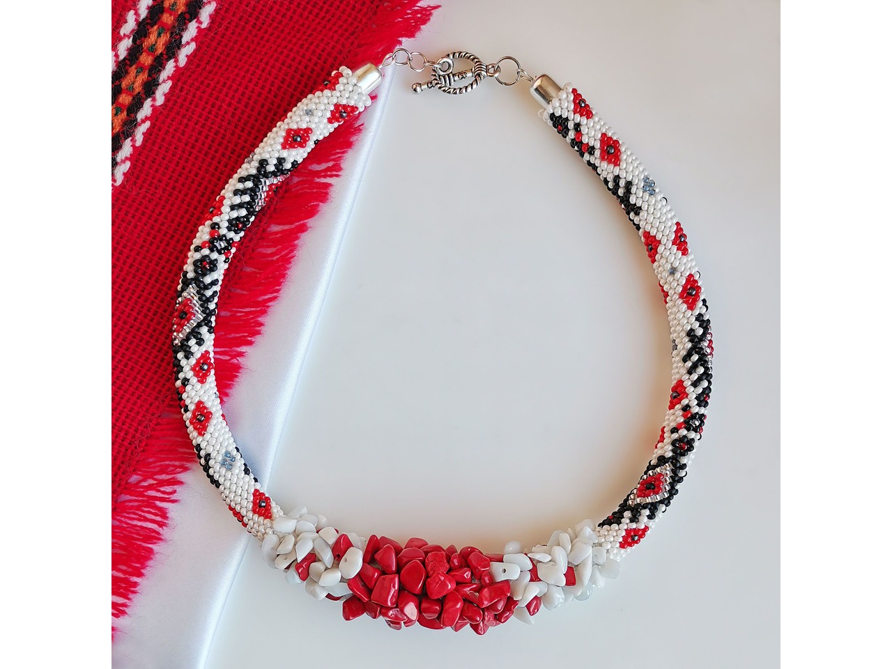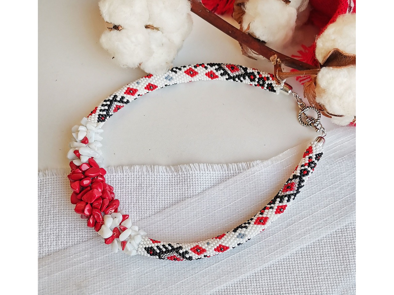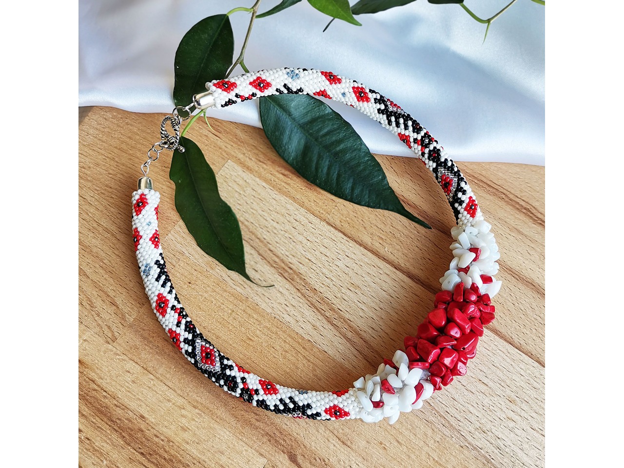 Джгут-кольє з чеського бісеру в стилі "вишиванка". Пориньте в чарівну гармонію традицій і краси з цією прикрасою. Втілення розкоші, вишуканості та національного духу, аксесуар додасть Вам неповторної чарівності. "Носи традиції з гордістю - сяй у своєму стилі!" Довжина із застібкою ок.43м, можливо подовжити ланцюжком.
