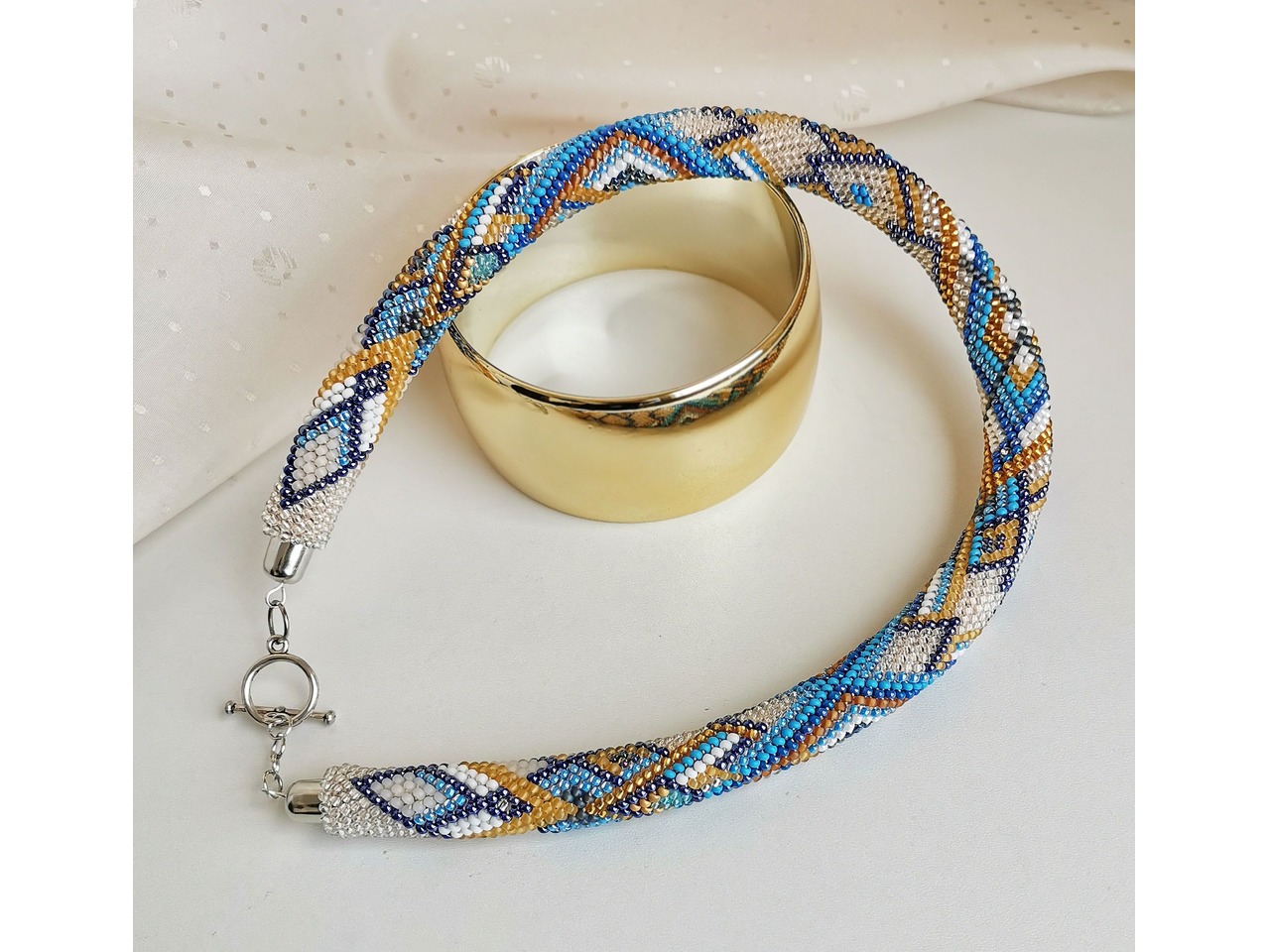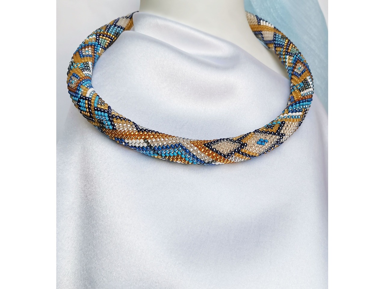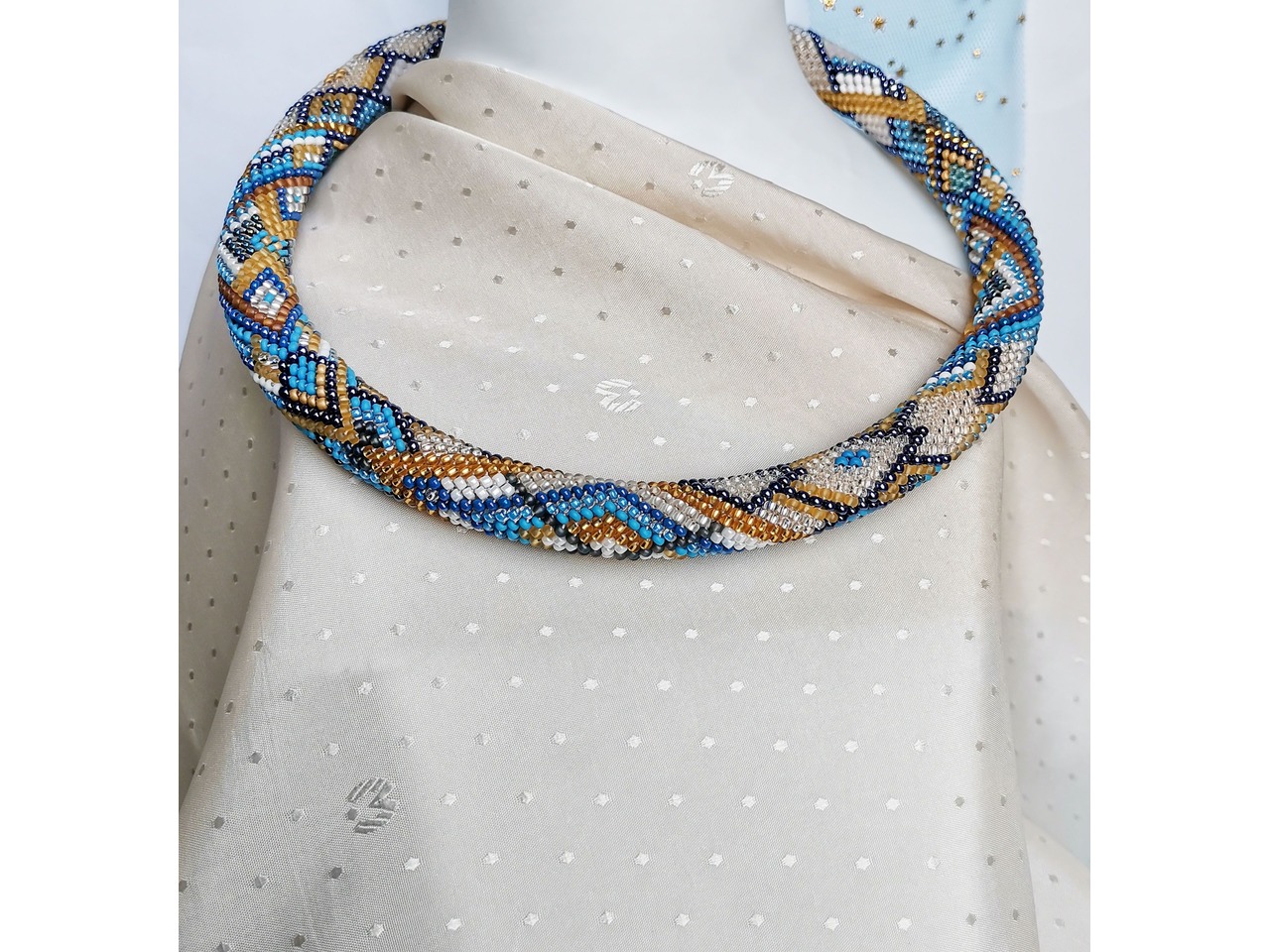 Джгут-кольє, зв'язаний з чеського бісеру. Ніжні відтінки та оригінальний візерунок додають легкого сяйва, освіжають образ, гармонійно його завершуючи. Коли хочеться виглядати стримано, стильно та трохи яскравіше - ця прикраса створена саме для вас. Довжина із застібкою ок 44 см, можна подовжити ланцюжком. Більше моїх робіт в інст:tatianalevchenko165