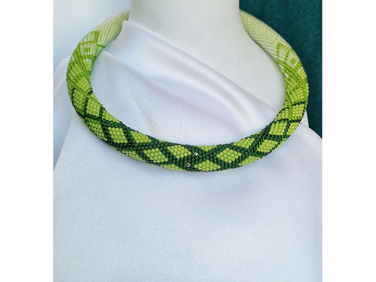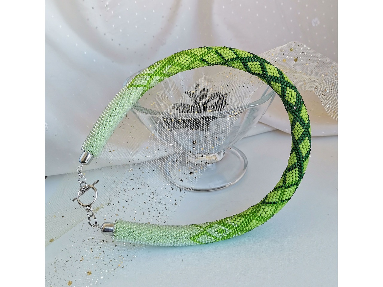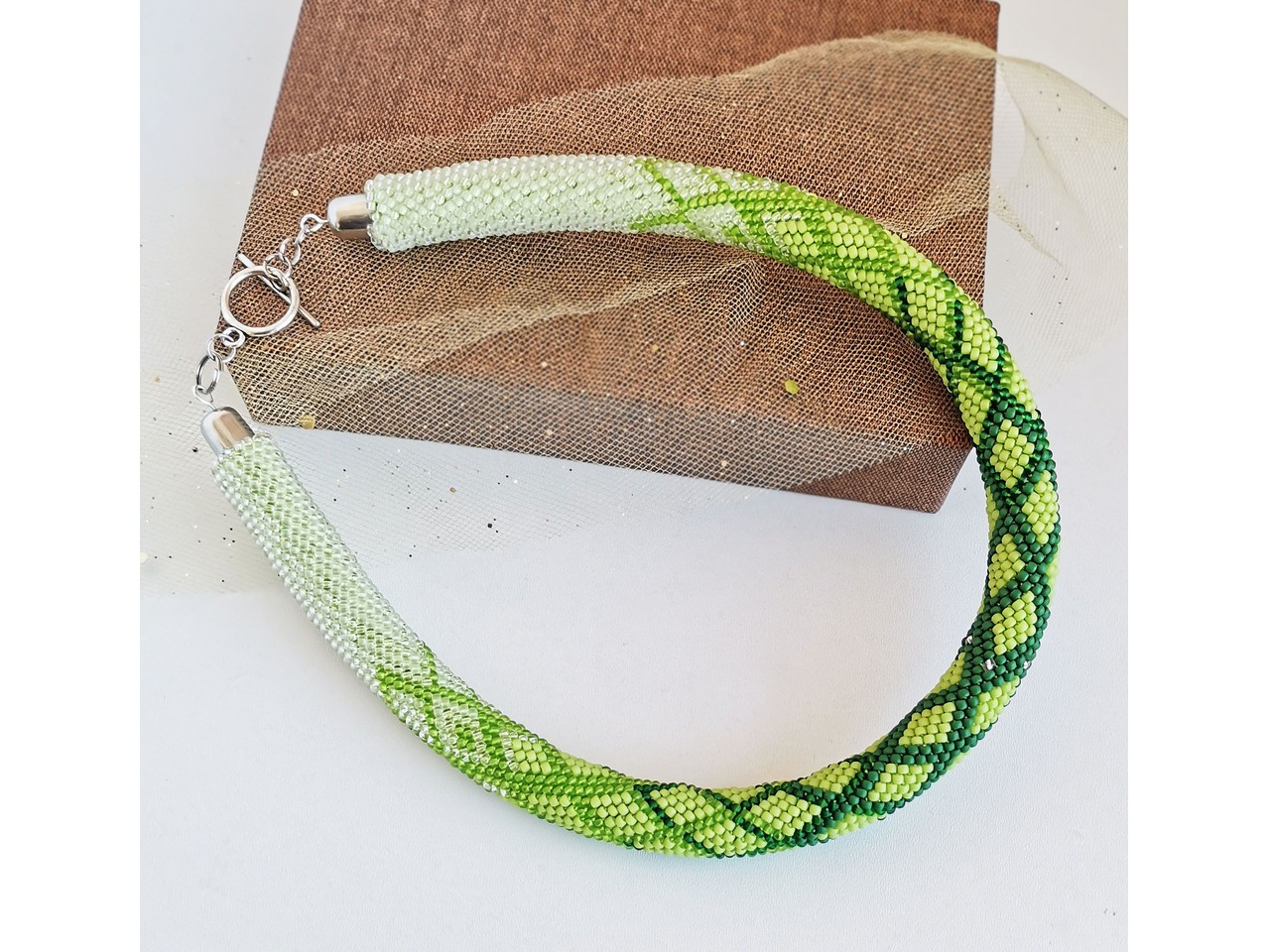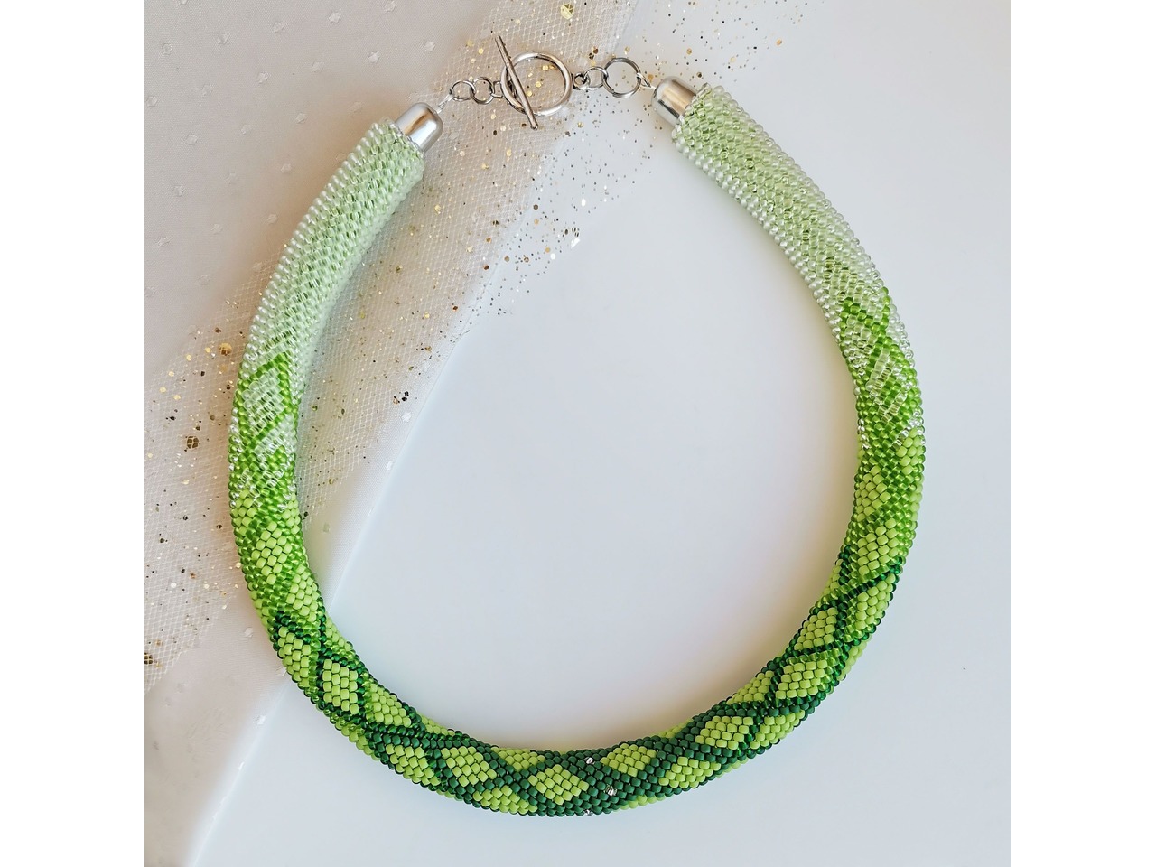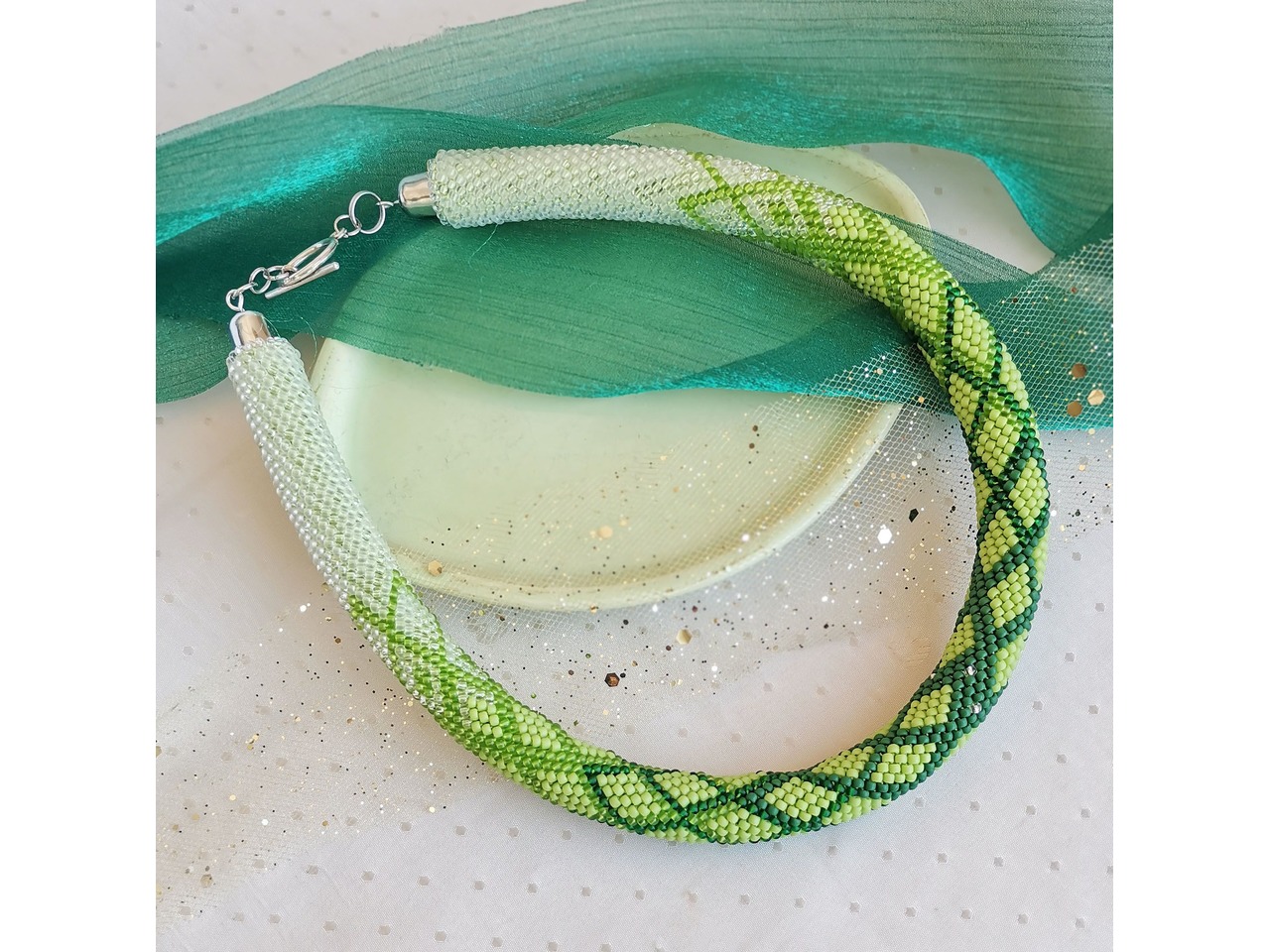 Ніжний джгут-кольє, зв'язаний з чеського бісеру. Пориньте у світ елегантності, спокою, внутрішньої краси і сили. Ця прикраса підкреслить ваш природний стиль, додасть образу свіжості і витонченості, стане акцентом, який притягує погляди і викликає захоплення. Носіть гармонію природи з собою! Довжина з застібкою ок 42 см, можна подовжити ланцюжком. Більше моїх робіт в інст:tatianalevchenko165