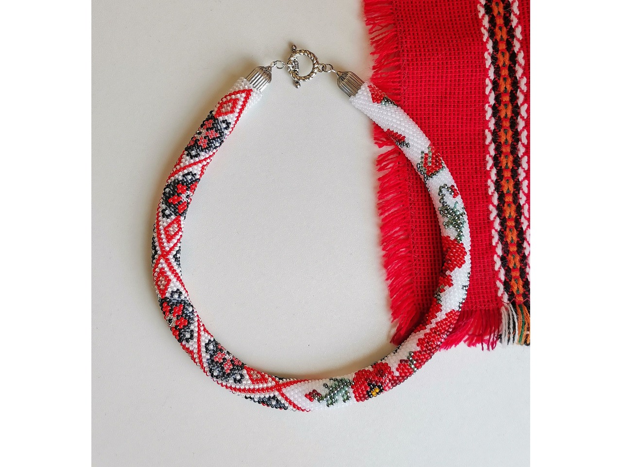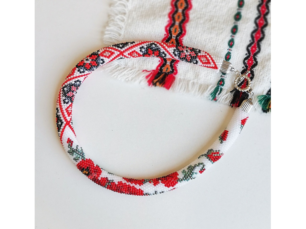 Джгут, зв'язаний із чеського бісеру в стилі "вишиванка". Мак - символ сили, життя і захисту від негативних впливів. Ця прикраса не тільки додасть Вам витонченого вигляду, але буде і своєрідним оберегом. Довжина із застібкою ок.43см. Більше моїх робіт в інст:tatianalevchenko165