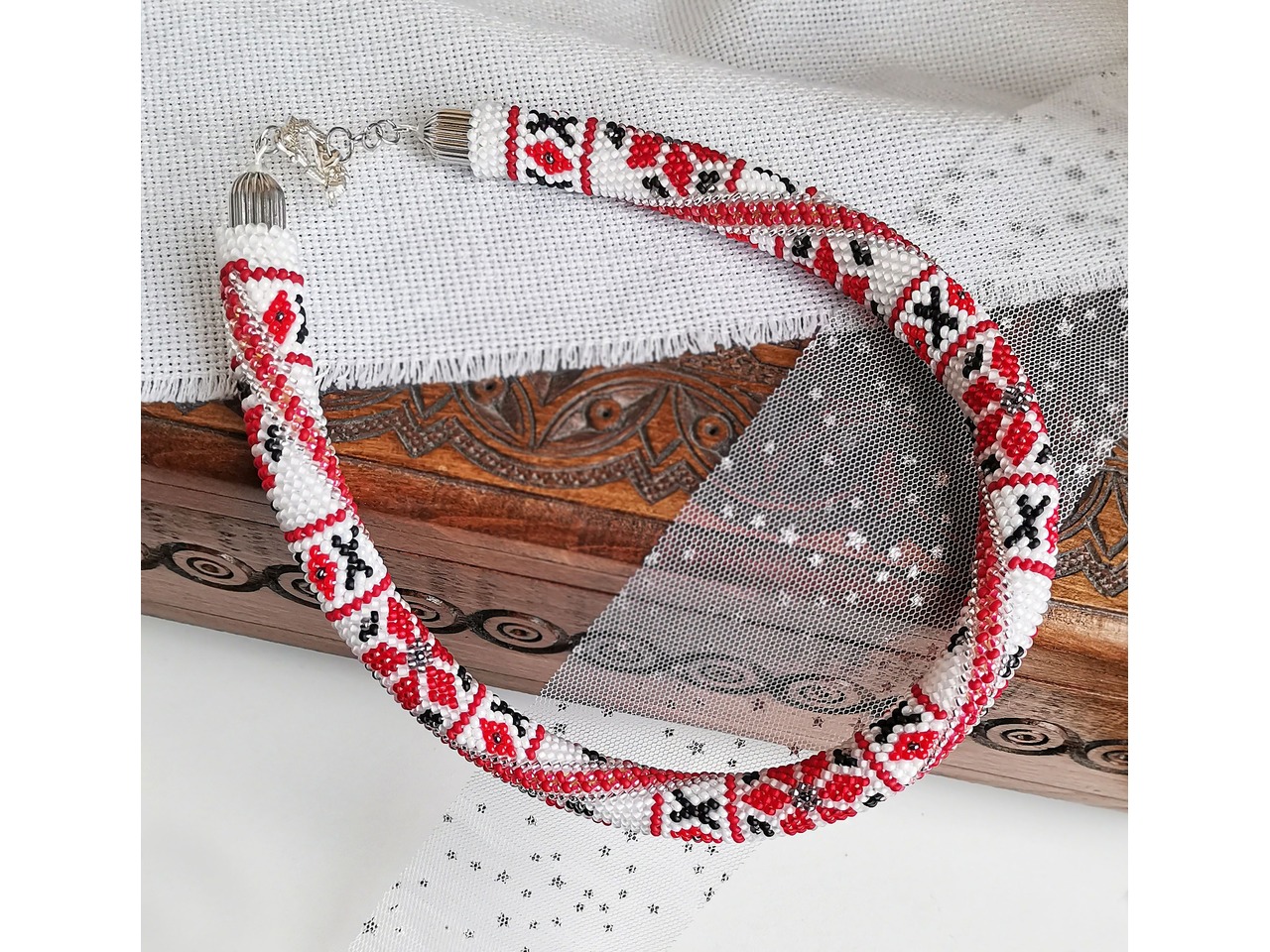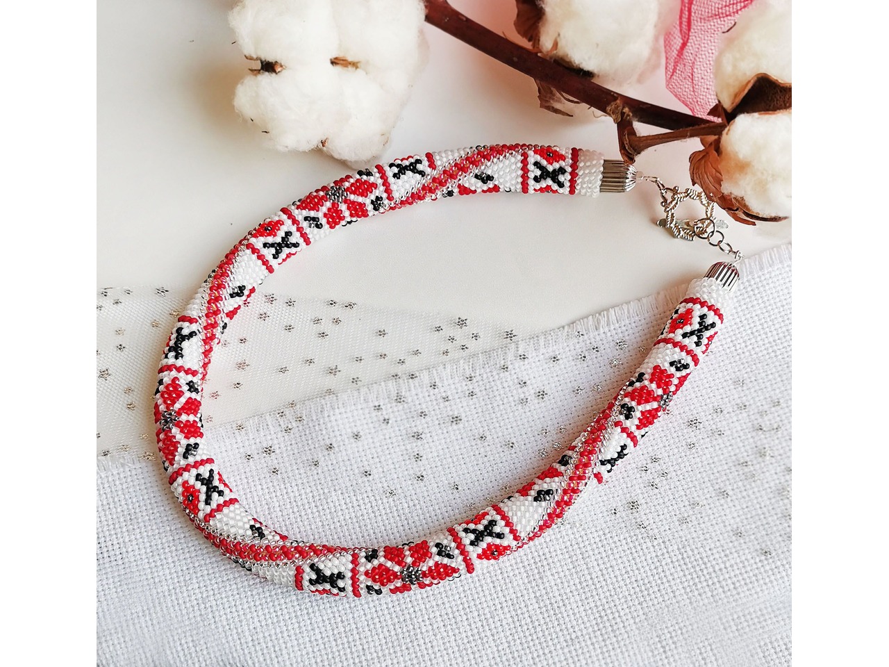 Джгут, зв'язаний із чеського бісеру в стилі вишиванка. Класичні відтінки здавна символізують життєву силу, чистоту і мудрість, а кожен елемент візерунка несе в собі глибокий символізм і гармонію. Ця прикраса стане не тільки стильним доповненням Вашого образу, а й потужним оберегом. Дозвольте собі доторкнутися до культурної спадщини через цей витончений аксесуар. Довжина із застібкою ок.44см, можливо продовжити ланцюжком, Більше моїх робіт в інст:tatianalevchenko165