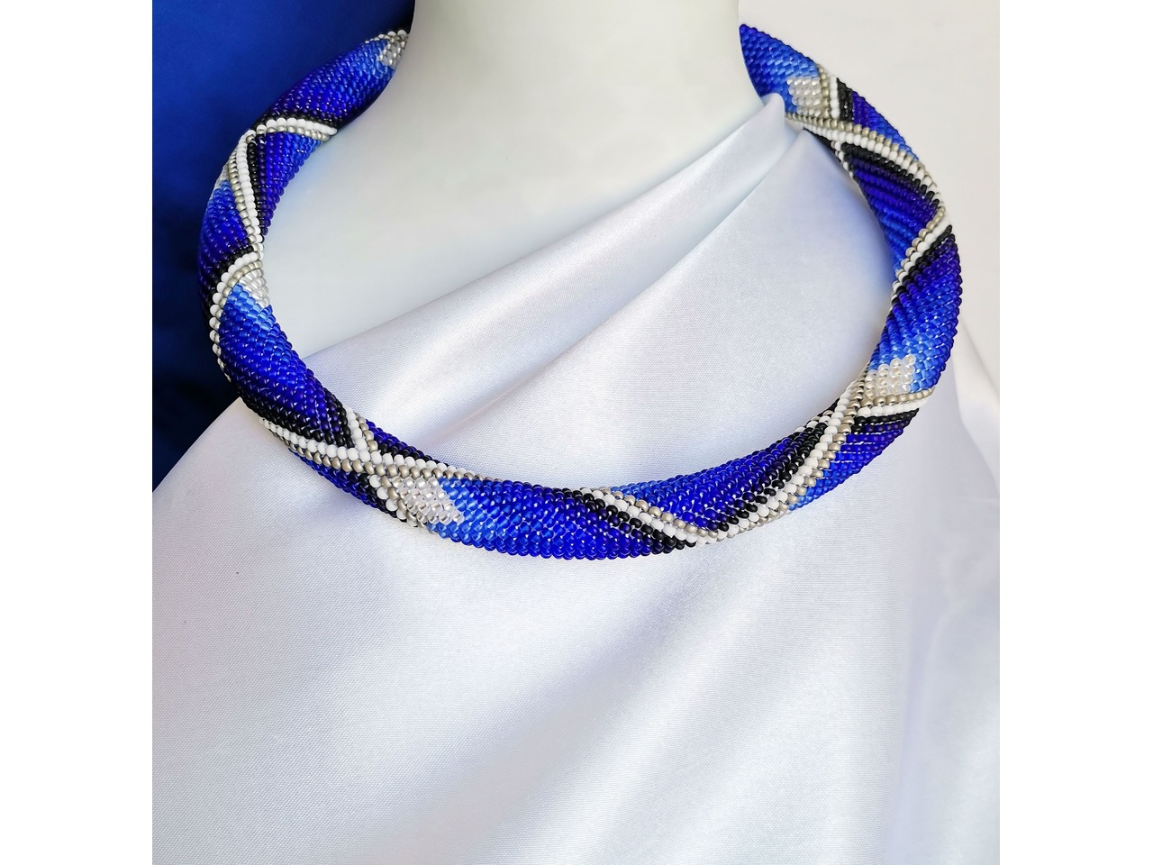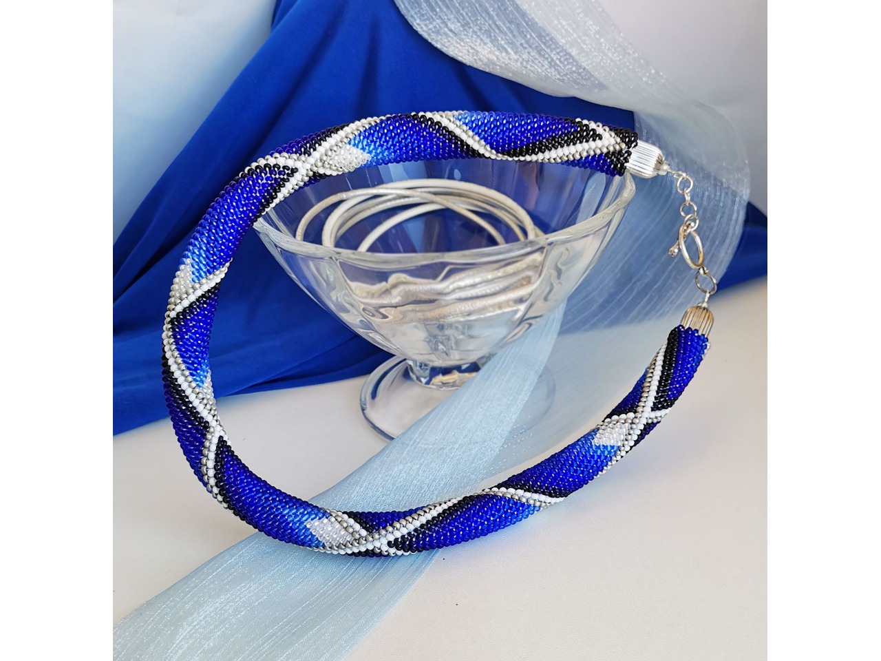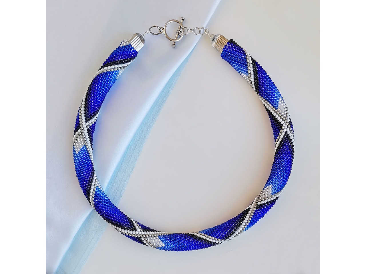Стильне кольє-жгут з чеського бісеру в яскравих ультрамаринових тонах. Глибокі відтінки переплітаються у витонченому візерунку, створюючи ефект руху і легкої гри світла. У цій прикрасі - магія кольору, яка підкреслить Вашу ніжність і унікальність. Нехай цей незрівнянний аксесуар додасть особливого стилю і виразності Вашому образу. Довжина з застібкою близько 44 см, можливо продовжити ланцюжком. Більше моїх робіт в інст:tatianalevchenko165