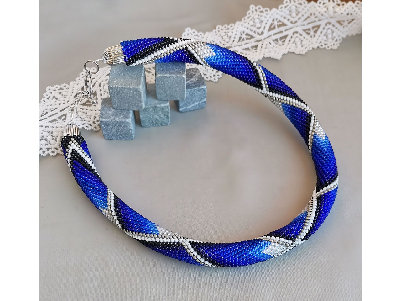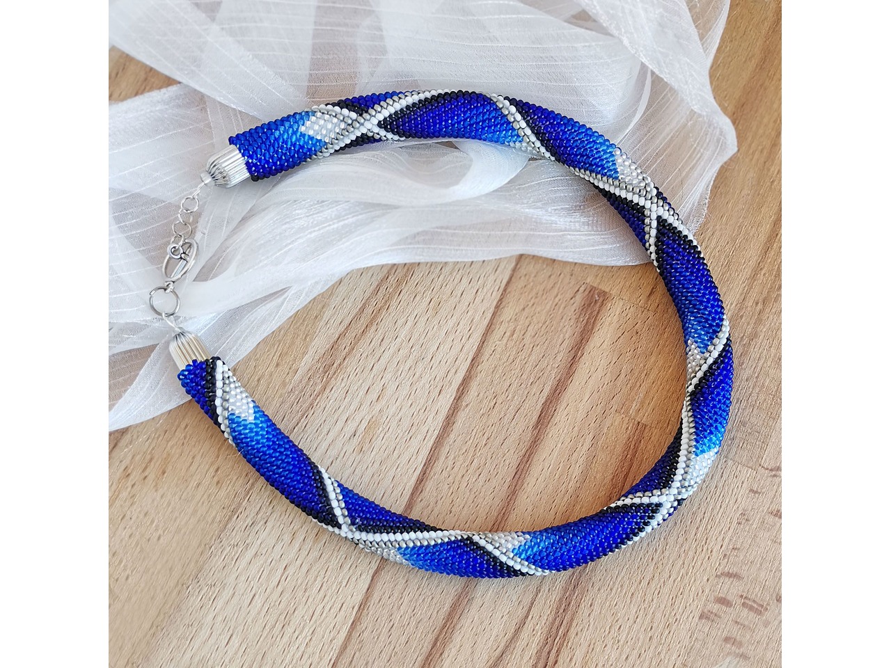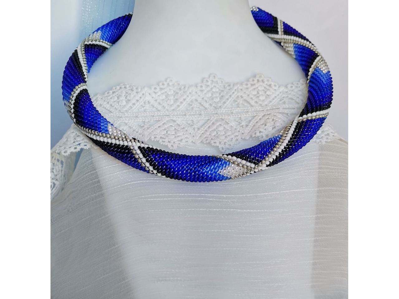 Стильне кольє-жгут з чеського бісеру в яскравих ультрамаринових тонах. Глибокі відтінки переплітаються у витонченому візерунку, створюючи ефект руху і легкої гри світла. У цій прикрасі - магія кольору, яка підкреслить Вашу ніжність і унікальність. Нехай цей незрівнянний аксесуар додасть особливого стилю і виразності Вашому образу. Довжина з застібкою близько 44 см, можливо продовжити ланцюжком. Більше моїх робіт в інст:tatianalevchenko165