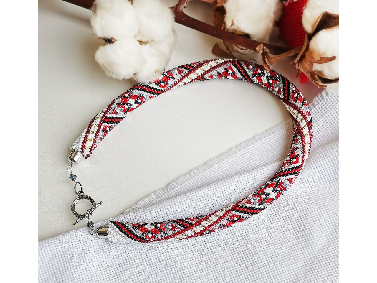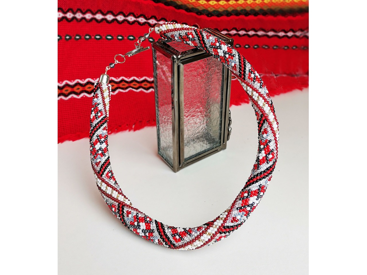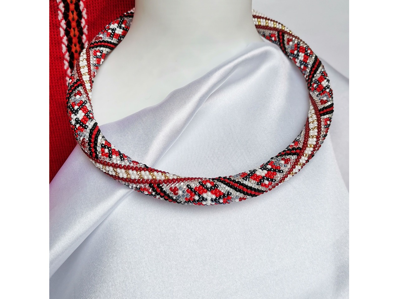 Джгут із чеського бісеру в стилі "вишиванка". Чарівна прикраса поєднує в собі сучасні тенденції та класичний дизайн, створюючи ідеальний баланс між старим і новим. Ніжне та витончене кольє додасть вашому образу унікальності та вишуканості. Довжина із застібкою ок.43см. Більше моїх робіт в інст:tatianalevchenko165