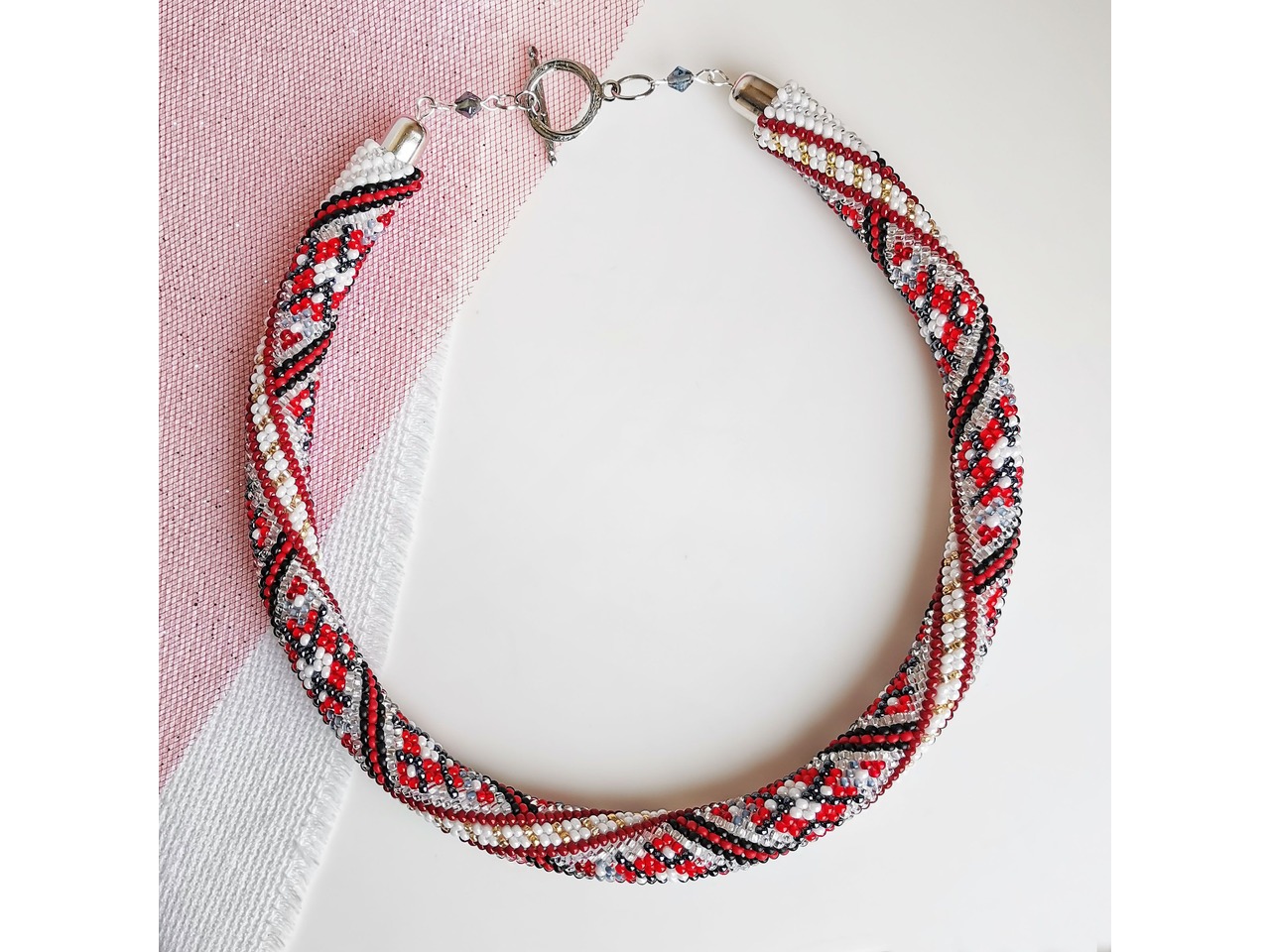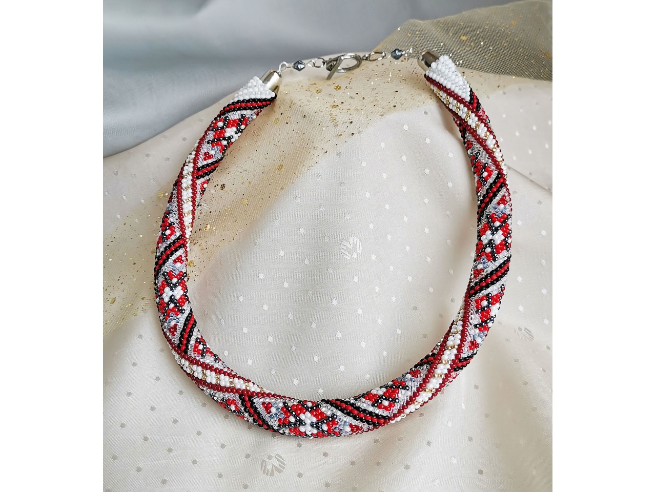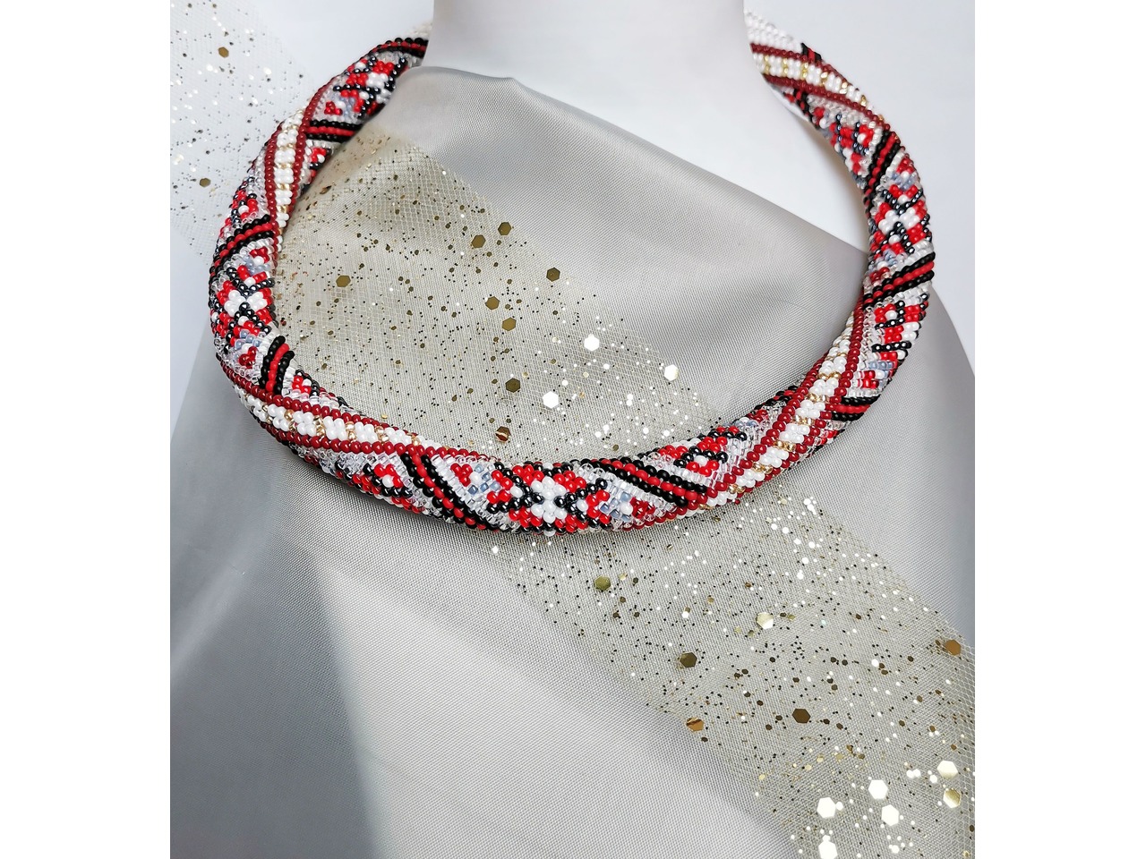 Джгут із чеського бісеру в стилі "вишиванка". Чарівна прикраса поєднує в собі сучасні тенденції та класичний дизайн, створюючи ідеальний баланс між старим і новим. Ніжне та витончене кольє додасть вашому образу унікальності та вишуканості. Довжина із застібкою ок.43см. Більше моїх робіт в інст:tatianalevchenko165