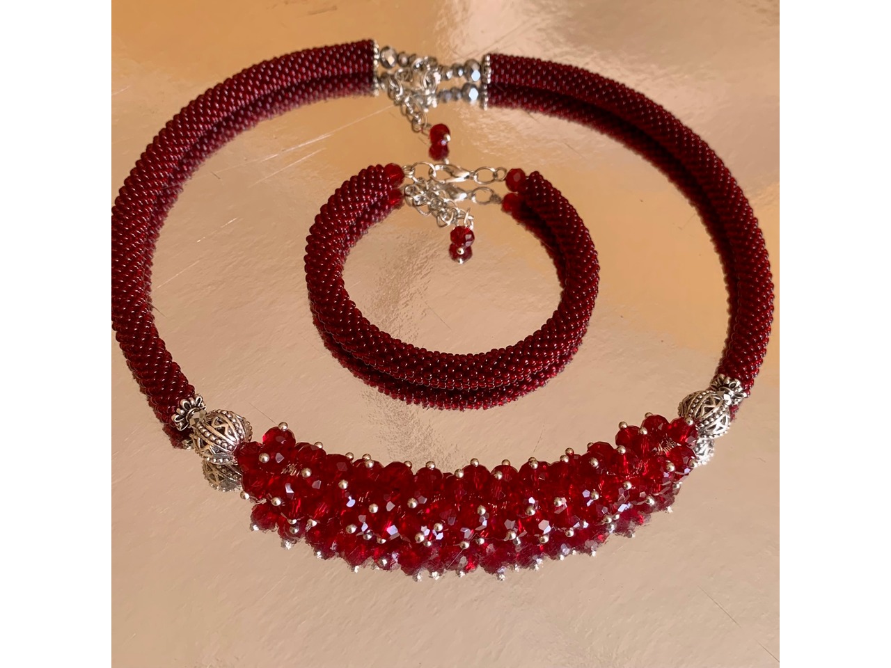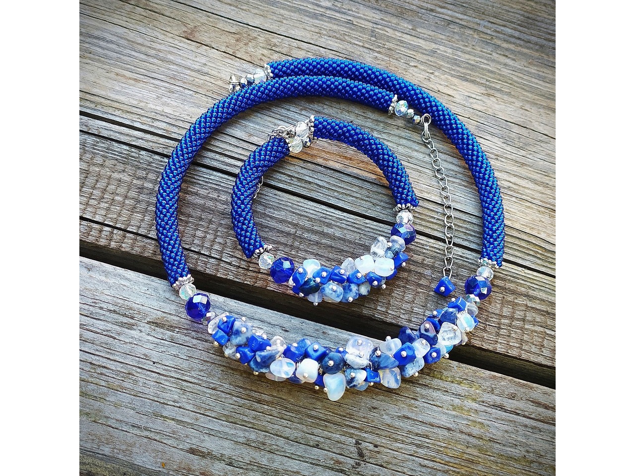 Комплект прикрас (намисто та браслет) на металевій основі зв′язаний з чешського бісеру з додаванням крихти натурального каміння та якісної фурнітури під срібло. Не важкі. В наявності червоний з крихтою натуральних каменів коралу, синій з крихтою натурального місячного каменю та лазуриту, білий з агатом та місячним камінням. Кольє 45 см та подовжувач ланцюжок 7 см.