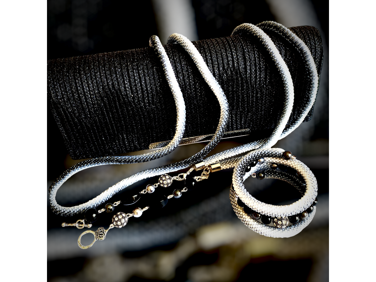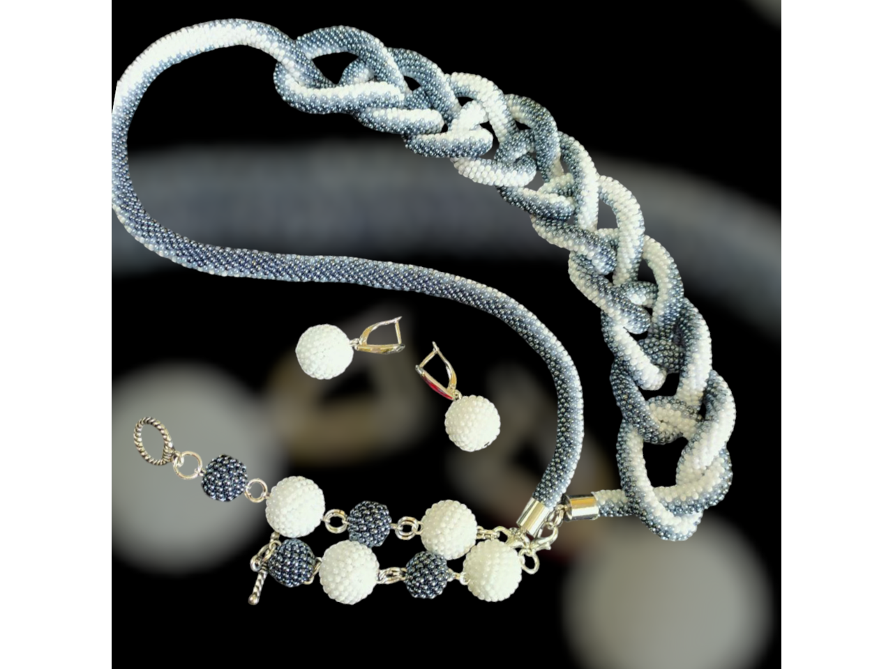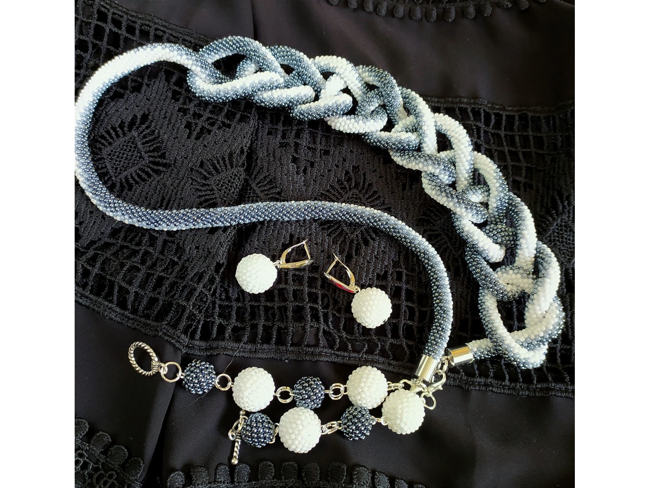 Ларіат зв′язаний з чеського якісного бісеру. Довжина в′язаної частини ларіату 150 см та підвіски по 12 см, які відстібуються. Для підвісок використані обшиті бісером намистини та фурнітура, які не обтяжують прикрасу. Ларіат можна заплітати у косу, робити різні вузли, носити як пояс і таким чином кожного разу створювати новий образ, виглядати стильно і яскраво. Швензи для сережок із медичного золота. Прикраси гарно пасують до вишиванки. Комплект також буде гарним подарунком для жінки будь-якого віку. Для комплекту можна замовити браслет (ціну уточнюйте)