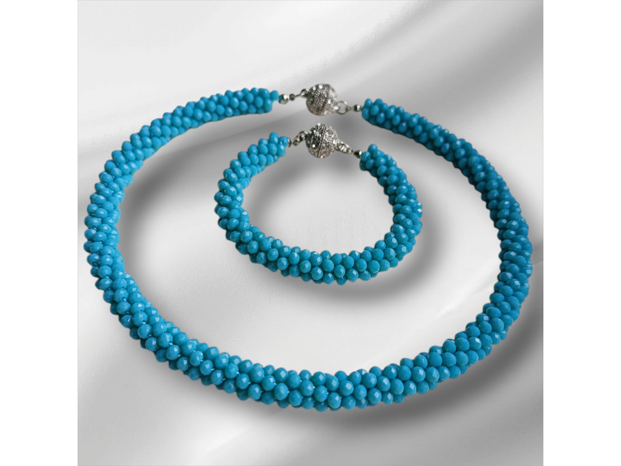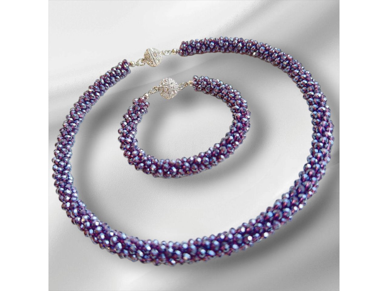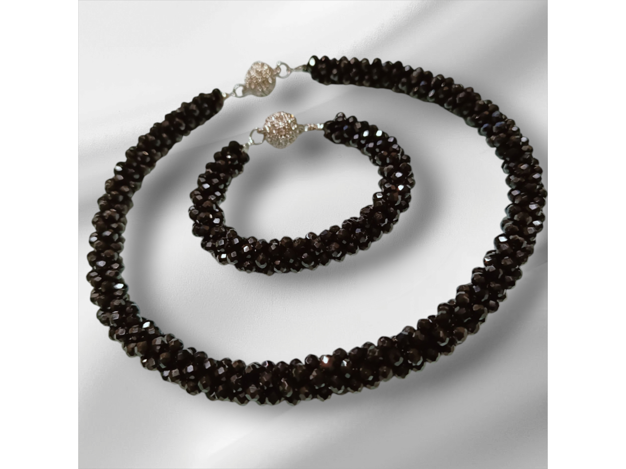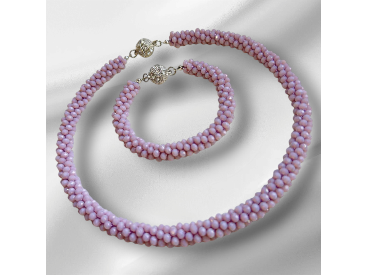 Кольє-джгут та браслет зв′язаний з кришталевих намистин колір: сірий, зелений, чорний, розовий, фіолетовий, бордовий, блакитний, лаванда). Дуже стильно та вишукано пасує і до сукні, і до блузки, і до вишиванки, і до джинсового вбрання. Легко переливається та виблискує на сонці. Стане окрасою будь-якого образу. Довжина кольє 46 см, браслету уточнюйте. Застібки магнітні. Комплект трансформується за допомогою магнітів в довге намисто.