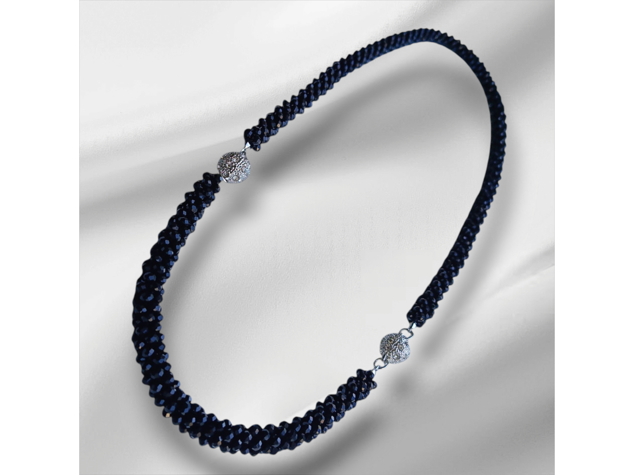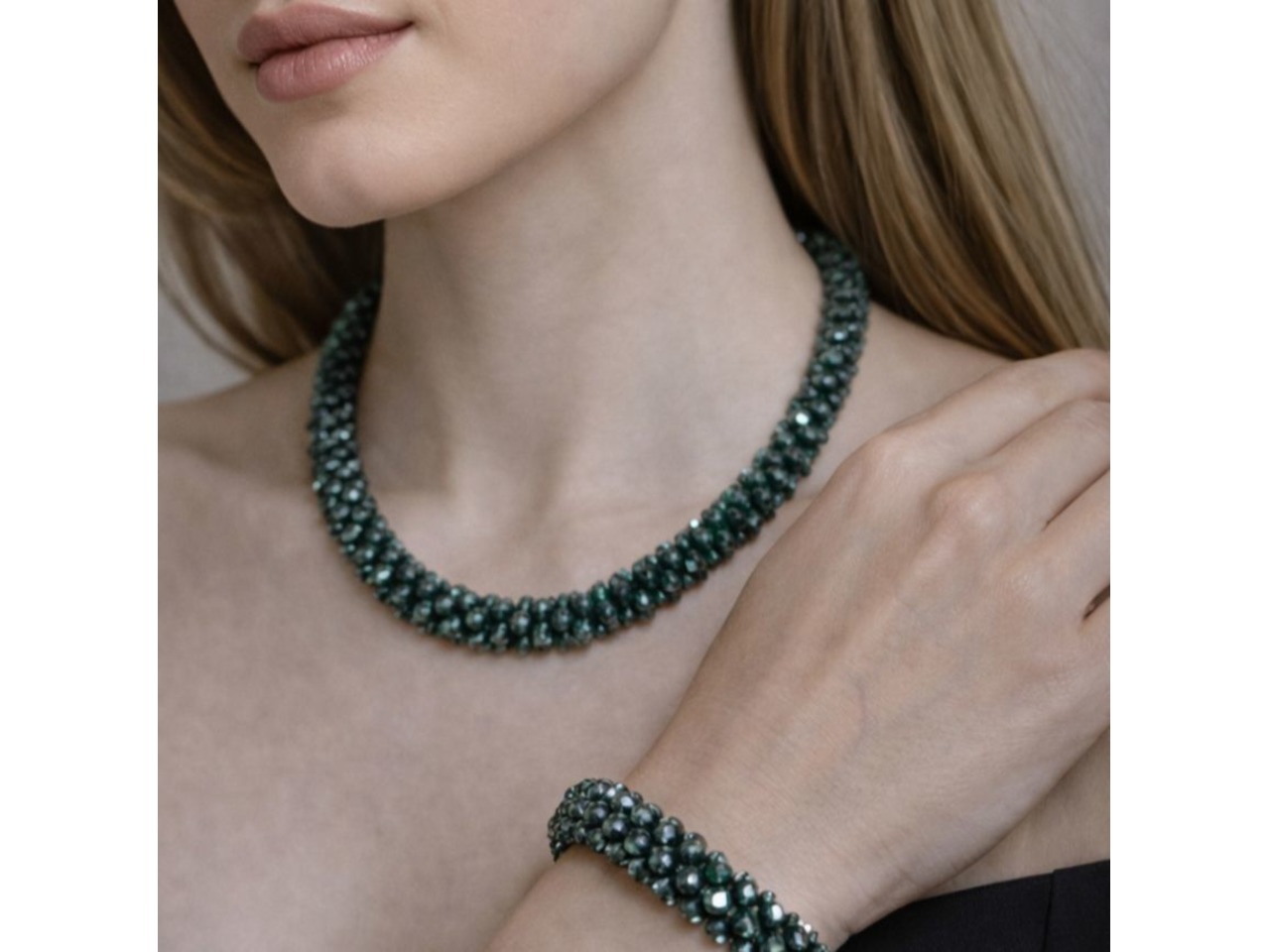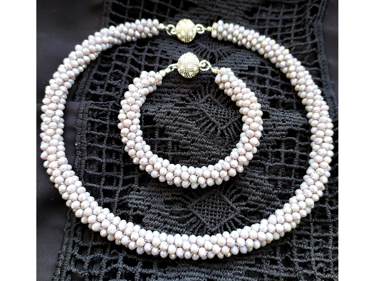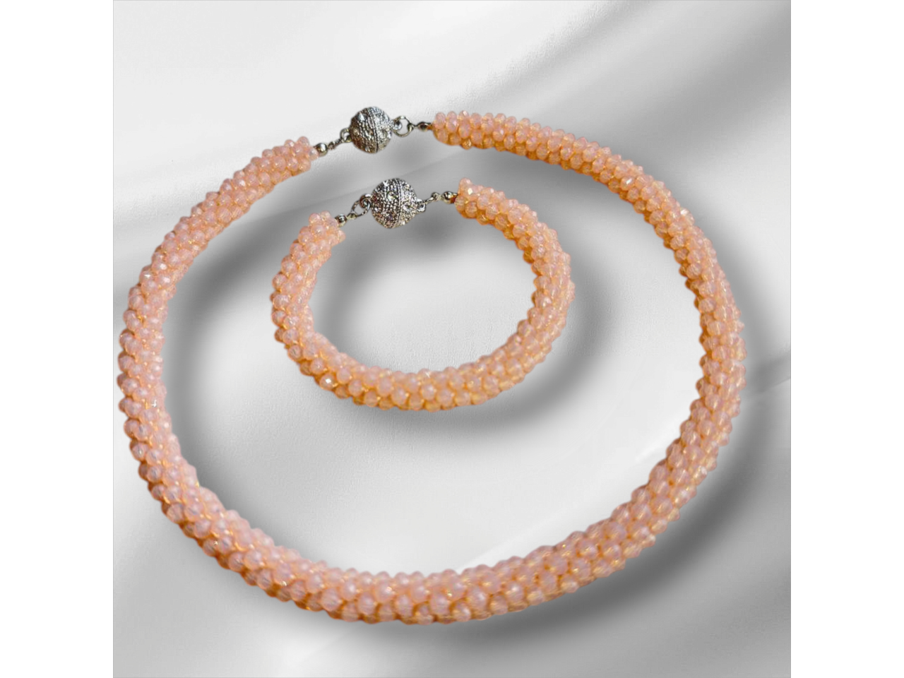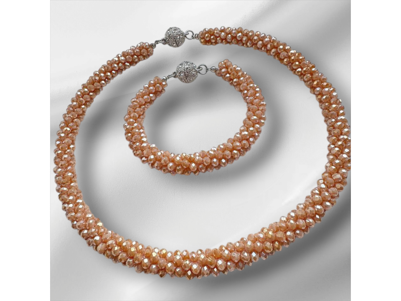Кольє-джгут та браслет зв′язаний з кришталевих намистин колір: сірий, зелений, чорний, розовий, фіолетовий, бордовий, блакитний, лаванда). Дуже стильно та вишукано пасує і до сукні, і до блузки, і до вишиванки, і до джинсового вбрання. Легко переливається та виблискує на сонці. Стане окрасою будь-якого образу. Довжина кольє 46 см, браслету уточнюйте. Застібки магнітні. Комплект трансформується за допомогою магнітів в довге намисто.