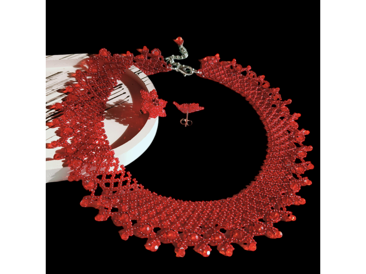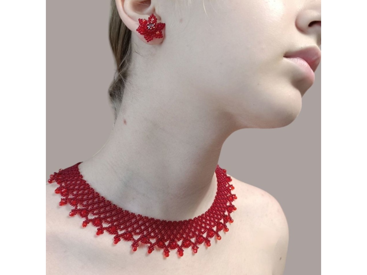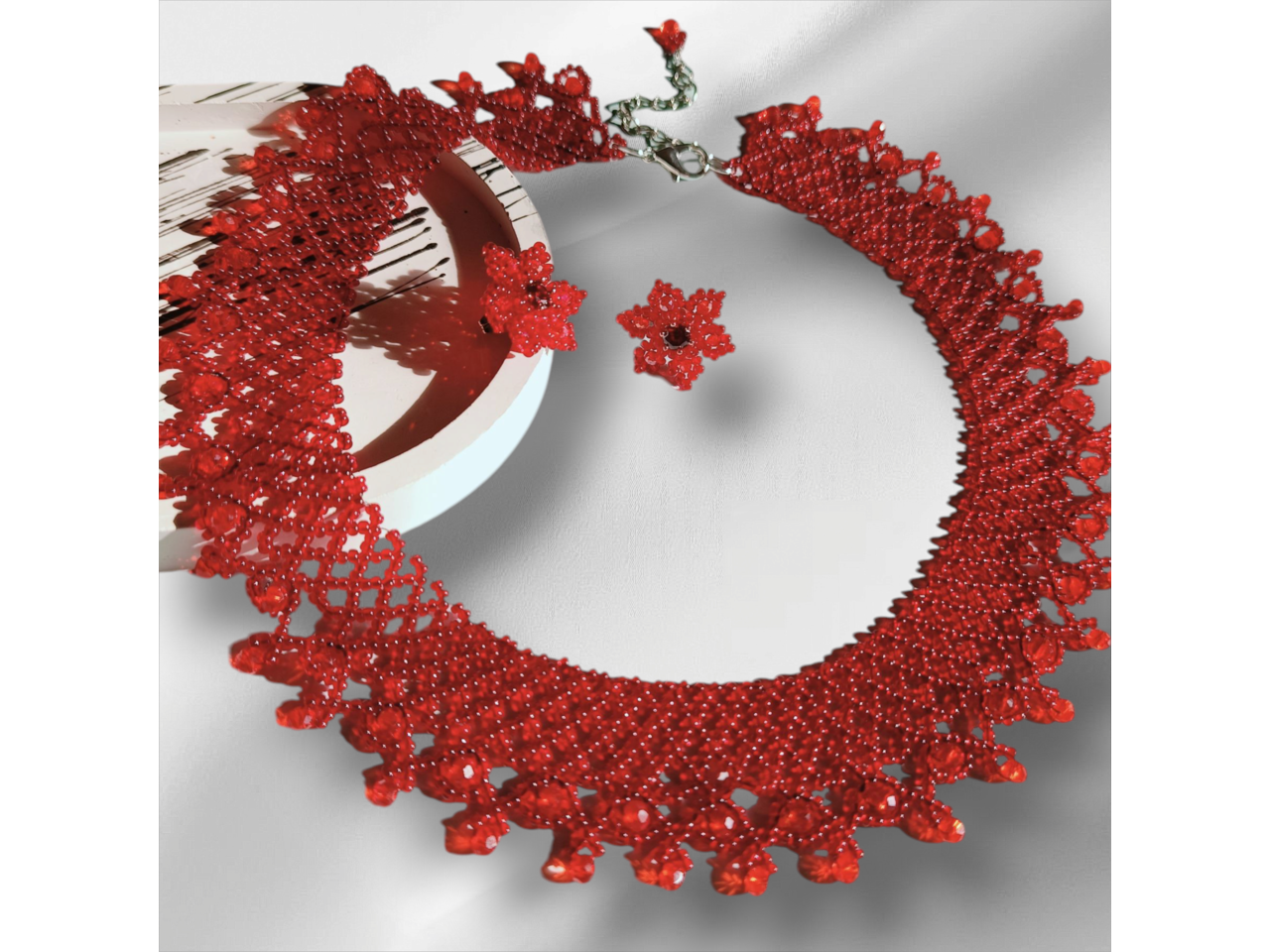 Стильна, красива і неймовірно ніжна силянка придасть чарівності власниці прикраси. Виготовлена з чеського бісеру та кришталевих намистин. Довжина 44 см, подовжувач 6 см. Ширина 3 см. В комплекті серги пусети квітоньки діаметр 2 см, швензи з медичного сплаву - не алергенні. В наявності червоний та синій комплект. Під замовлення (до 5 днів) виготовлю у будь-якому кольорі.