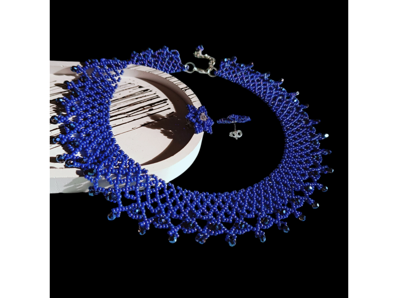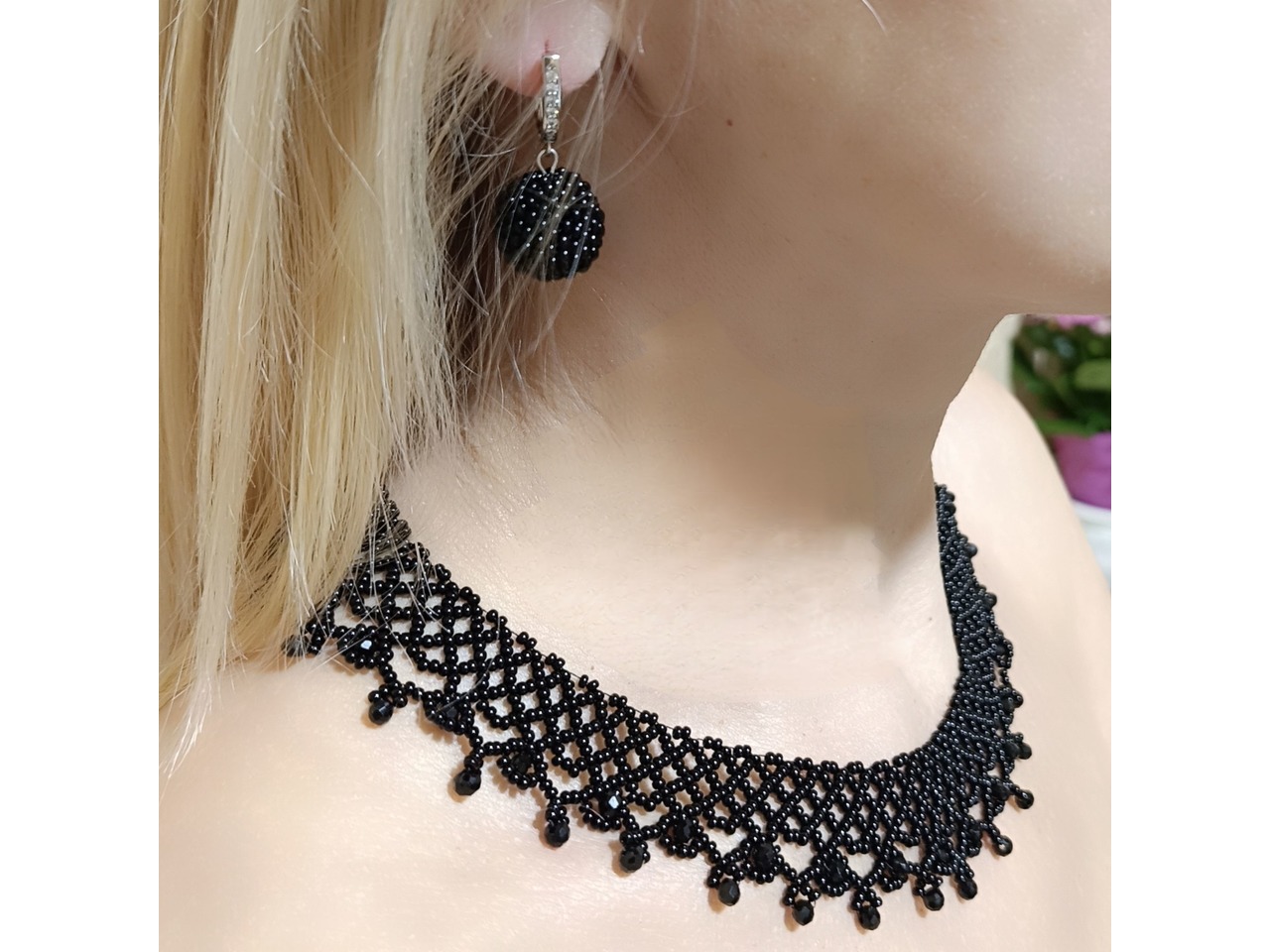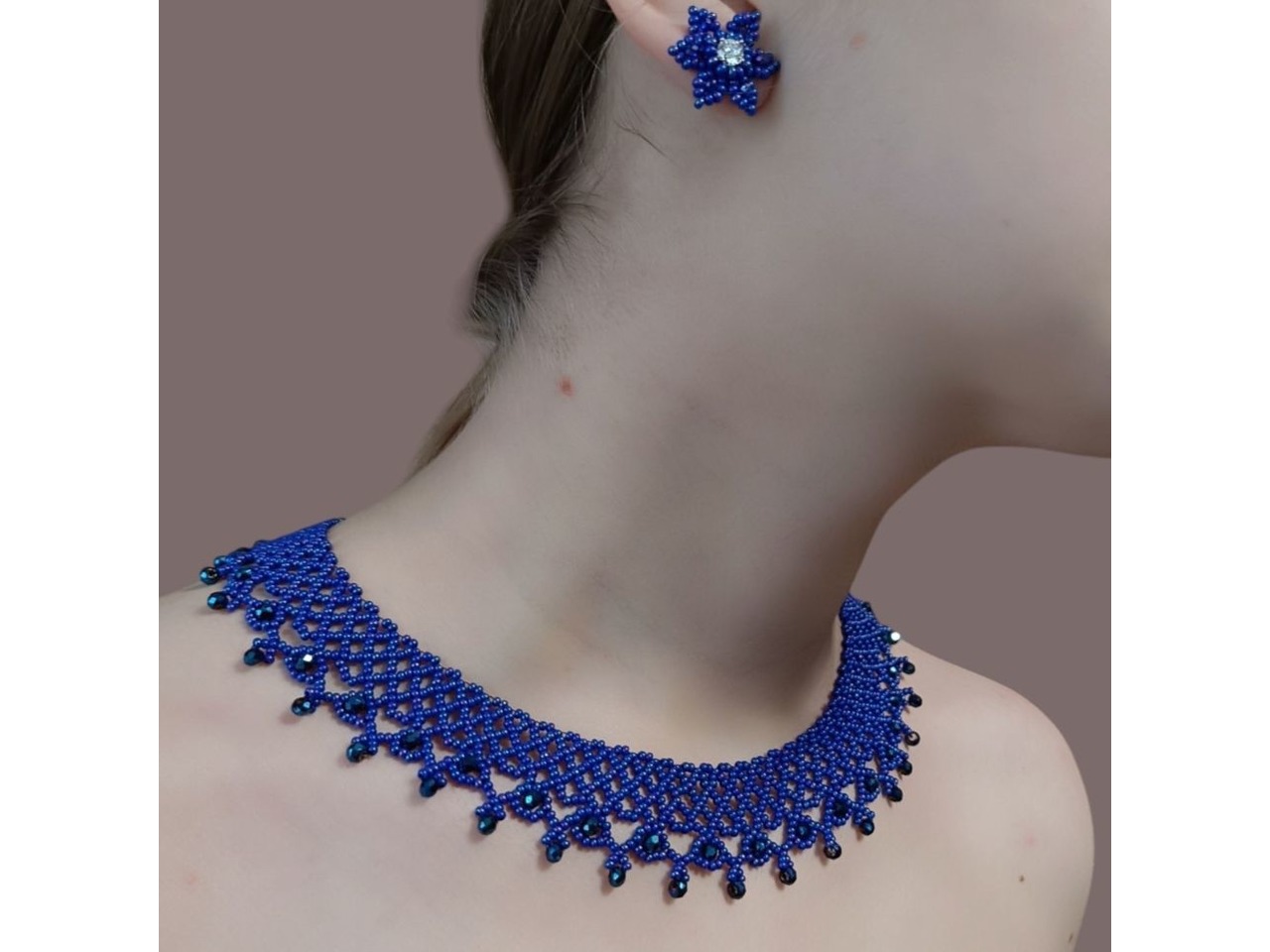 Стильна, красива і неймовірно ніжна силянка придасть чарівності власниці прикраси. Виготовлена з чеського бісеру та кришталевих намистин. Довжина 44 см, подовжувач 6 см. Ширина 3 см. В комплекті серги пусети квітоньки діаметр 2 см, швензи з медичного сплаву - не алергенні. В наявності червоний та синій комплект. Під замовлення (до 5 днів) виготовлю у будь-якому кольорі.