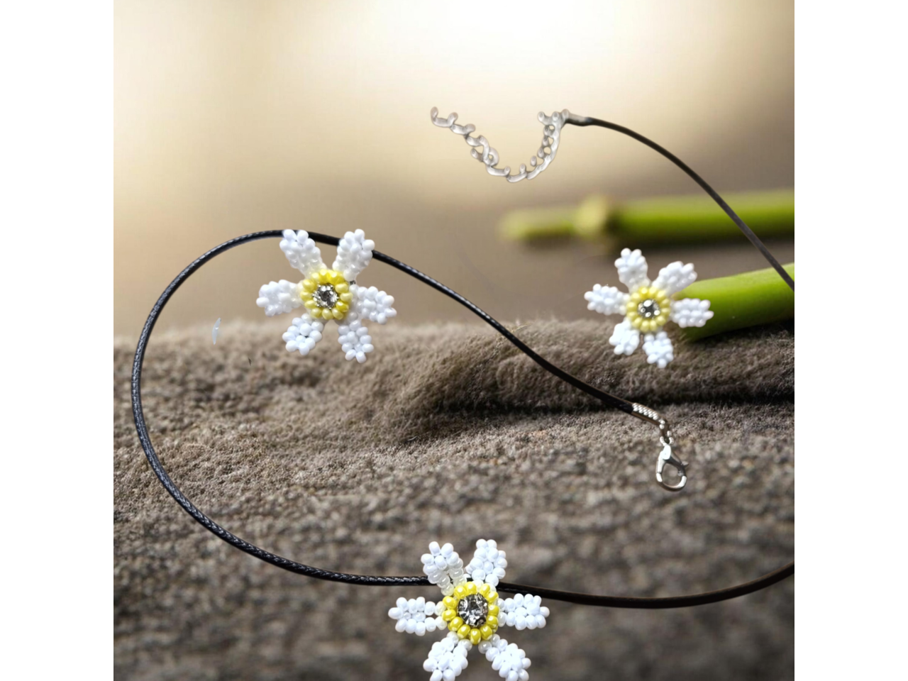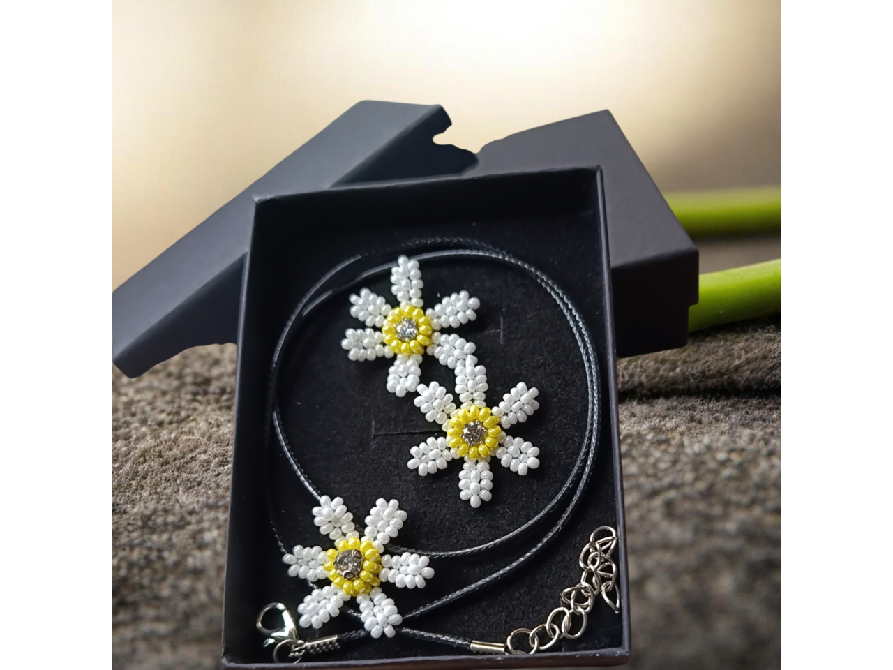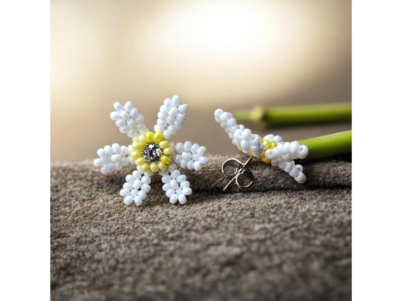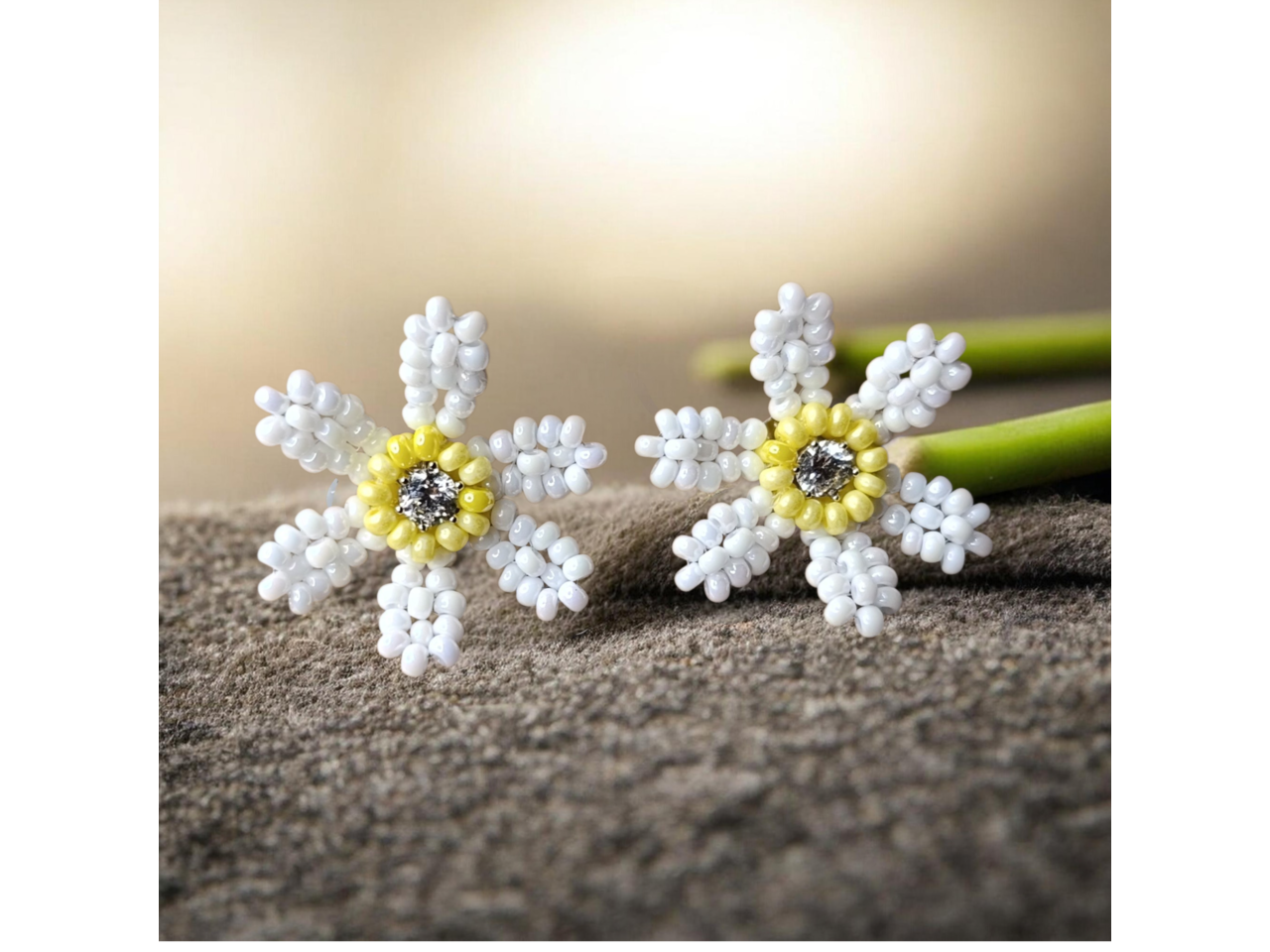 Ніжні сережки-гвоздики у формі ромашок – це втілення природної краси, легкості та жіночності. Виготовлені вручну з чеського бісеру, вони мають елегантну форму квітки з ніжною серединкою у вигляді страза, що додає виробу жвавого сяйва. Ці сережки стануть ідеальним акцентом для романтичного образу на весілля, випускний, свято або повсякденний стиль. Вони легкі, зручні та підкреслюють природну елегантність. Весняні, літні образи будуть наповнені ніжністю та додадуть індивідуальності, загадковості. Ідеальний варіант для подарунка дівчині чи жінці на день народження, річницю, випускний, День святого Валентина або просто як знак уваги. Сережки можуть бути як парний комплект для: мами та доньки, сестер, найкращих подруг чи колег.Деталі: